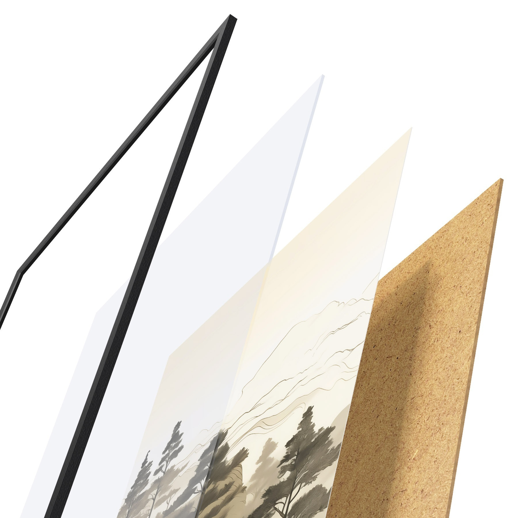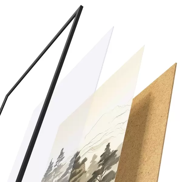 Plakat składa się z ramy, pleksi, wydrukowanego obrazu i podkładu z płyty wiórowej. Plakat można natychmiast zawiesić na ścianie dzięki uchwytom z tyłu.