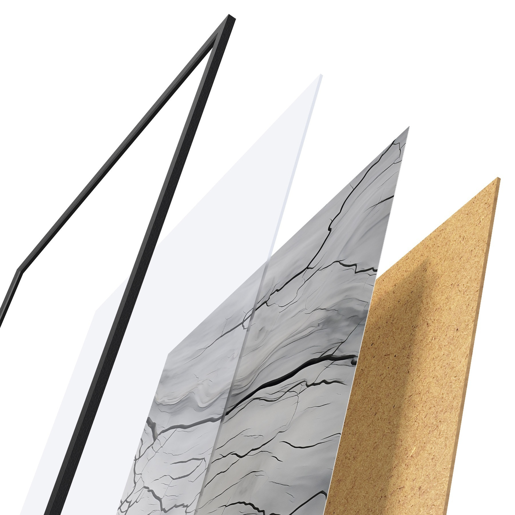 Plakat składa się z ramy, pleksi, wydrukowanego obrazu i podkładu z płyty wiórowej. Plakat można natychmiast zawiesić na ścianie dzięki uchwytom z tyłu.