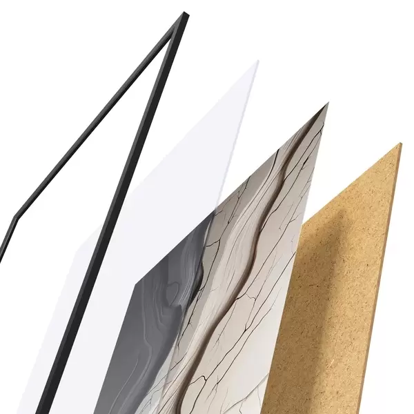 Plakat składa się z ramy, pleksi, wydrukowanego obrazu i podkładu z płyty wiórowej. Plakat można natychmiast zawiesić na ścianie dzięki uchwytom z tyłu.