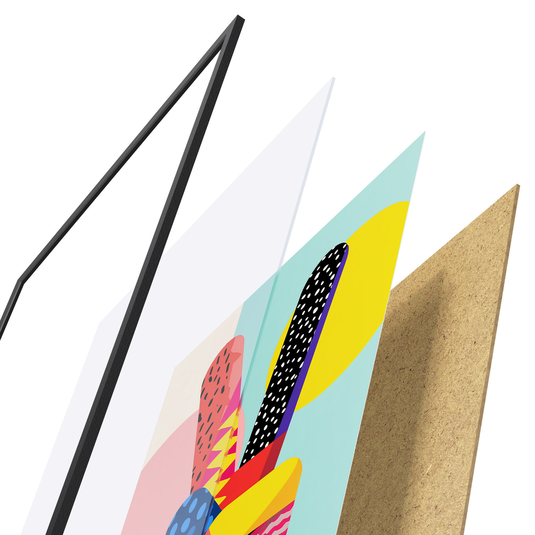 Plakat składa się z ramy, pleksi, wydrukowanego obrazu i podkładu z płyty wiórowej. Plakat można natychmiast zawiesić na ścianie dzięki uchwytom z tyłu.