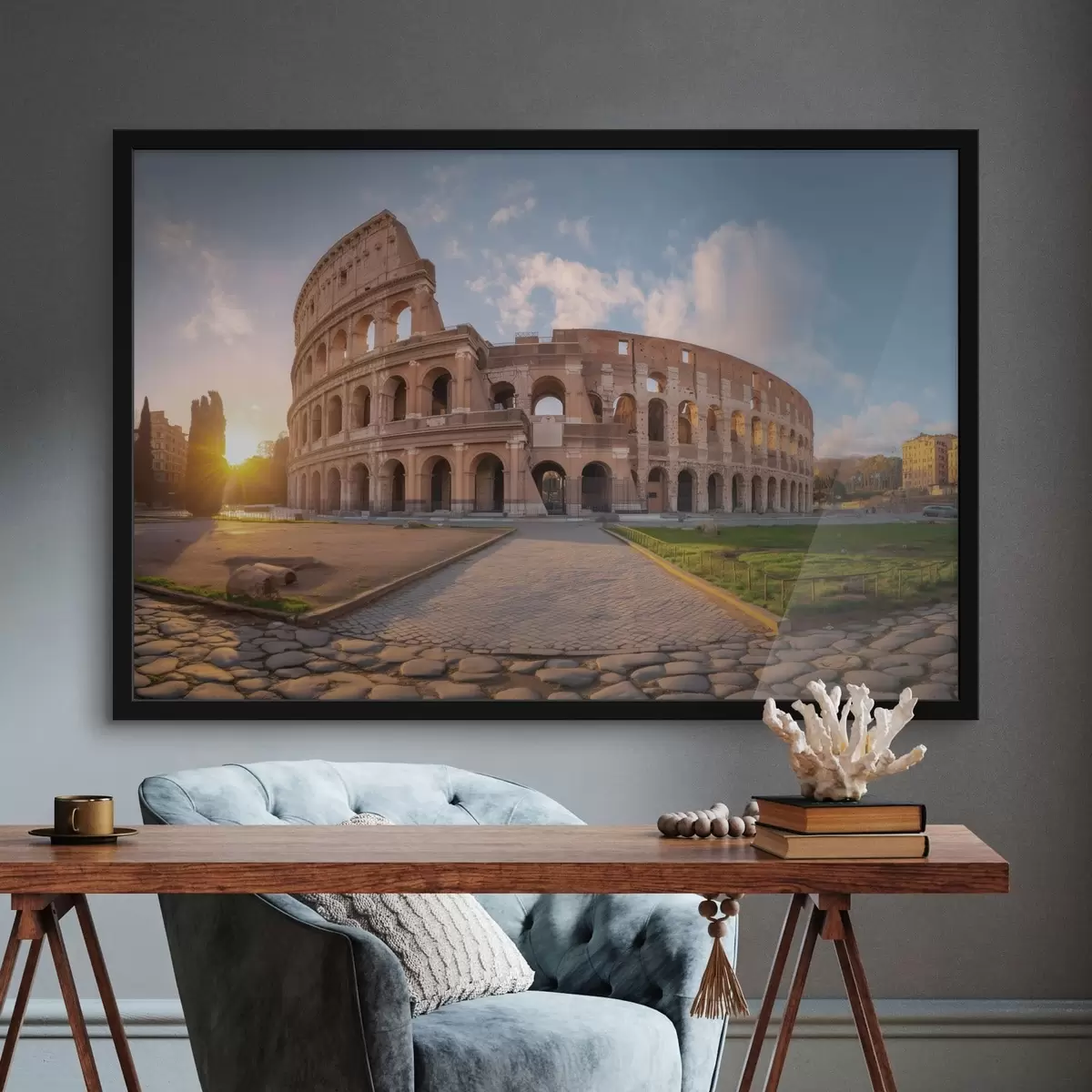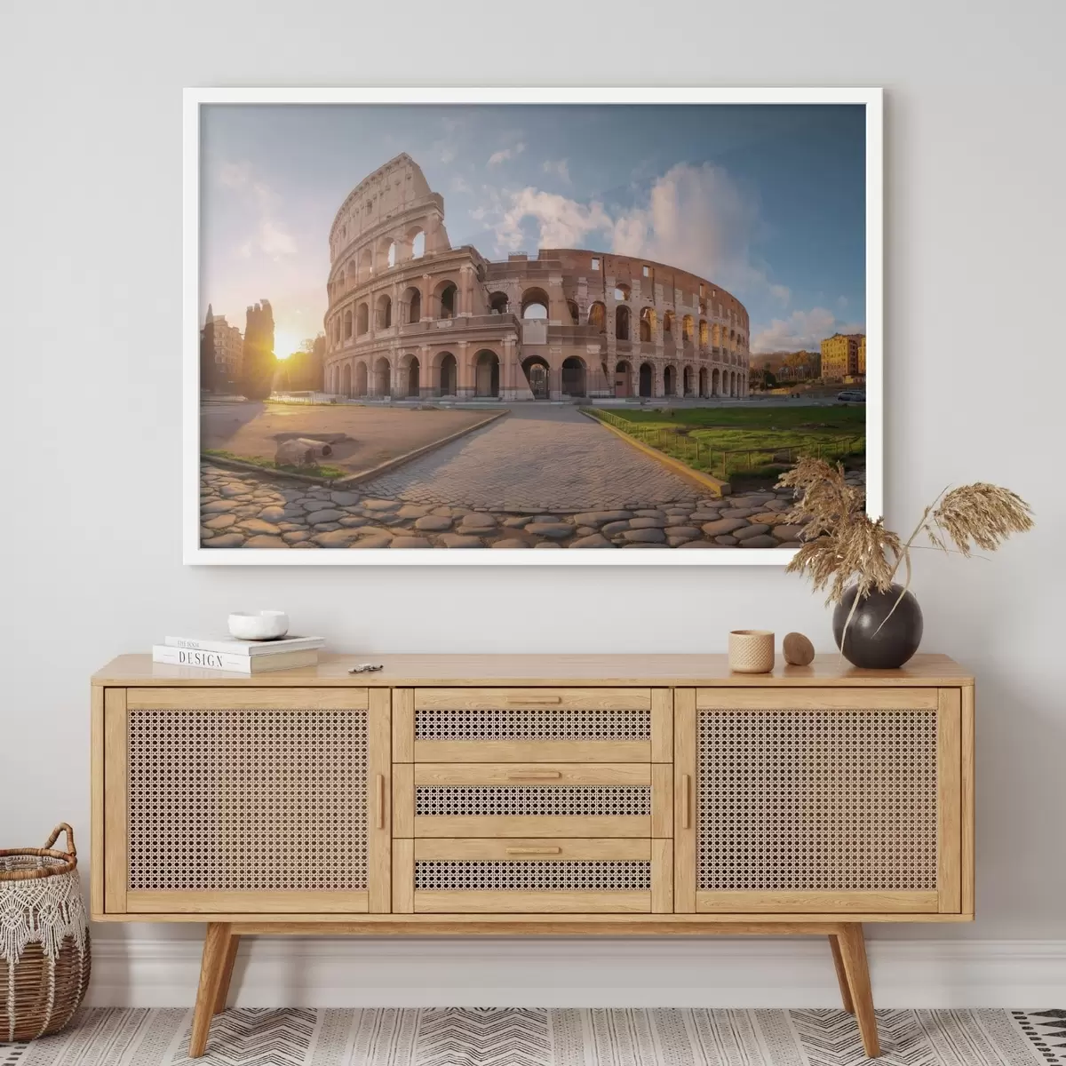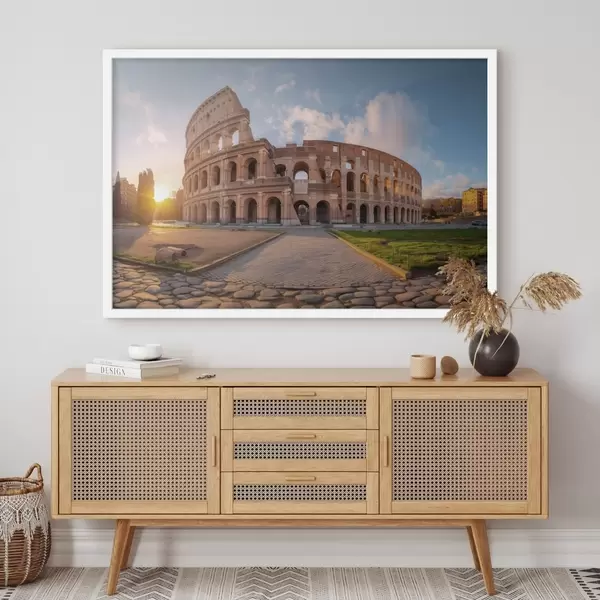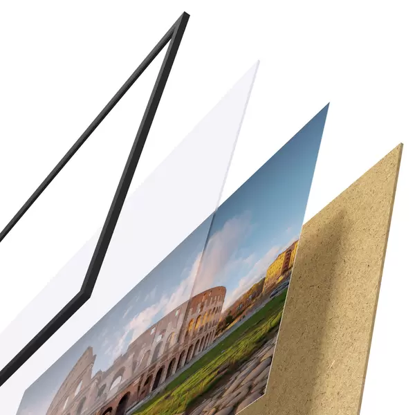Plakat składa się z ramy, pleksi, wydrukowanego obrazu i podkładu z płyty wiórowej. Plakat można natychmiast zawiesić na ścianie dzięki uchwytom z tyłu.