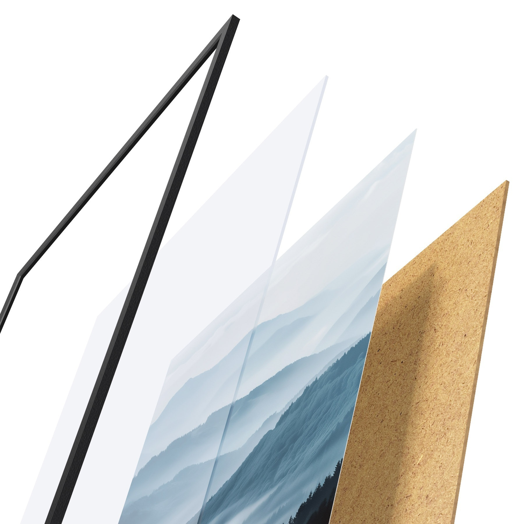 Plakat składa się z ramy, pleksi, wydrukowanego obrazu i podkładu z płyty wiórowej. Plakat można natychmiast zawiesić na ścianie dzięki uchwytom z tyłu.