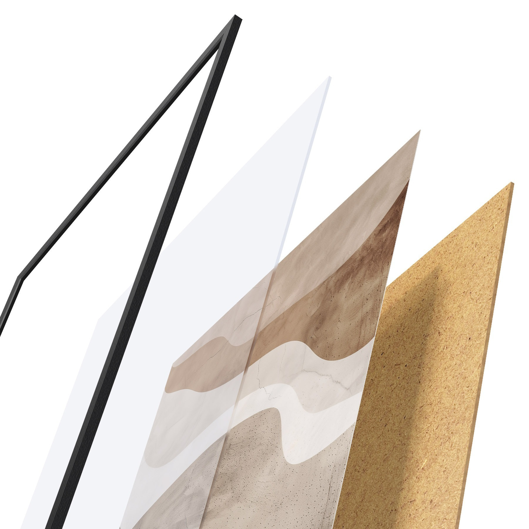 Plakat składa się z ramy, pleksi, wydrukowanego obrazu i podkładu z płyty wiórowej. Plakat można natychmiast zawiesić na ścianie dzięki uchwytom z tyłu.