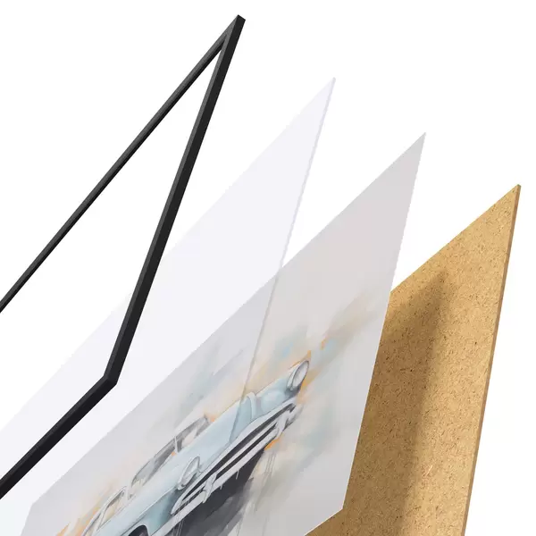 Plakat składa się z ramy, pleksi, wydrukowanego obrazu i podkładu z płyty wiórowej. Plakat można natychmiast zawiesić na ścianie dzięki uchwytom z tyłu.