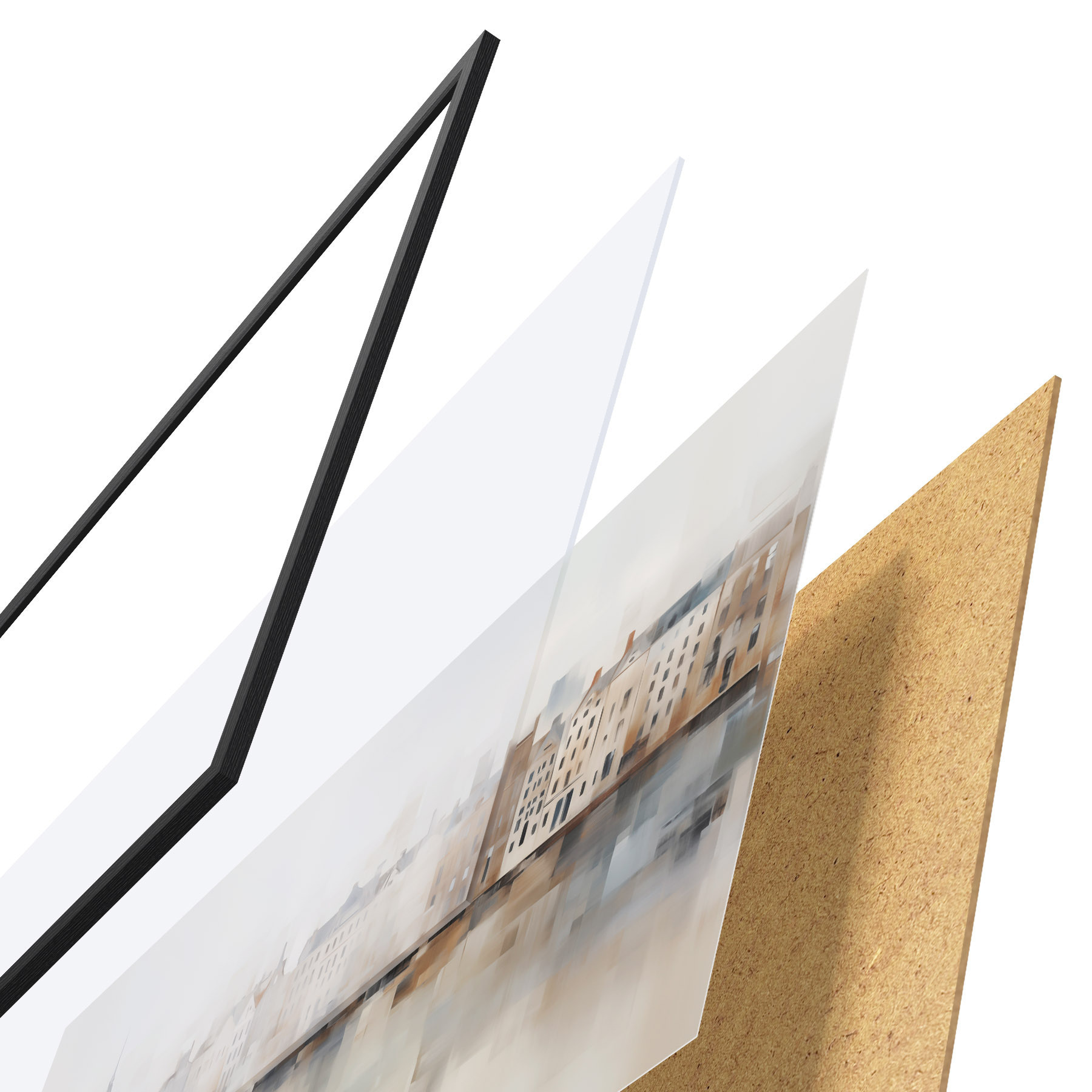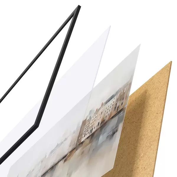 Plakat składa się z ramy, pleksi, wydrukowanego obrazu i podkładu z płyty wiórowej. Plakat można natychmiast zawiesić na ścianie dzięki uchwytom z tyłu.
