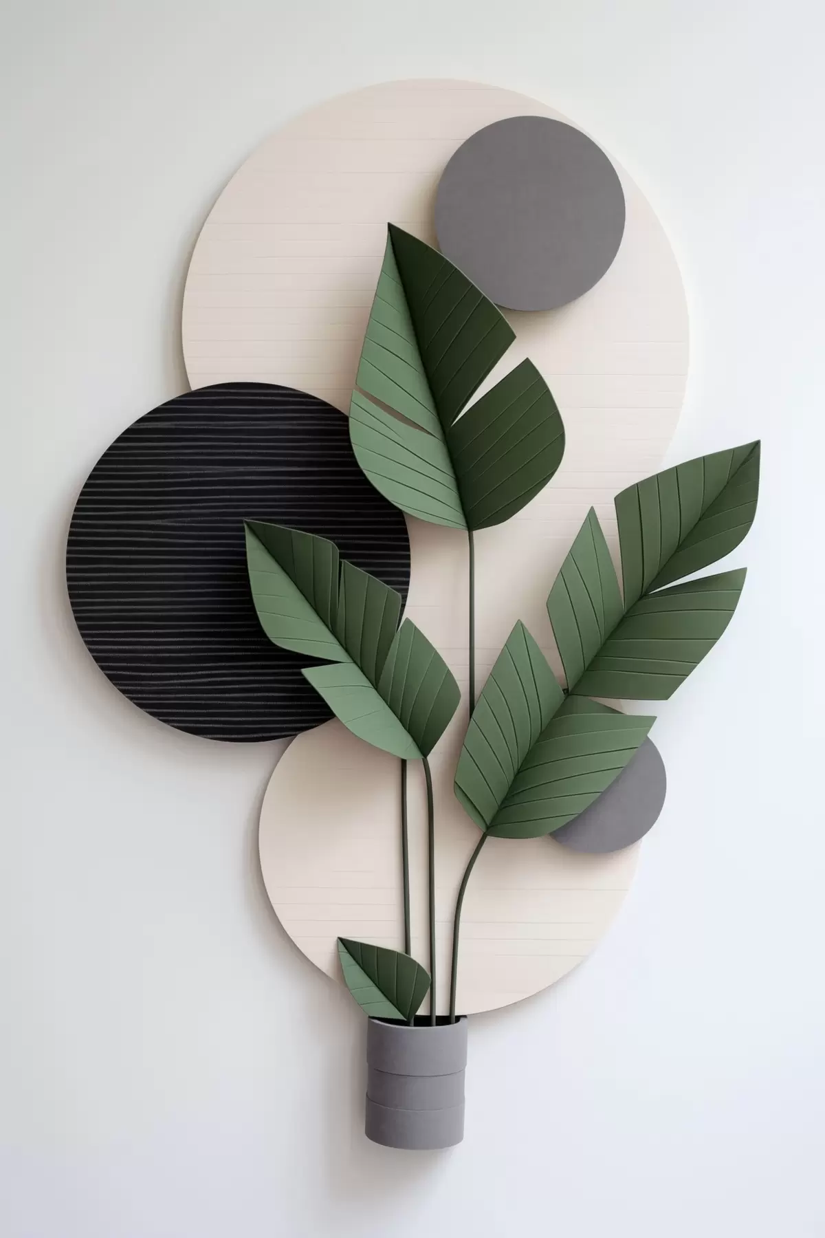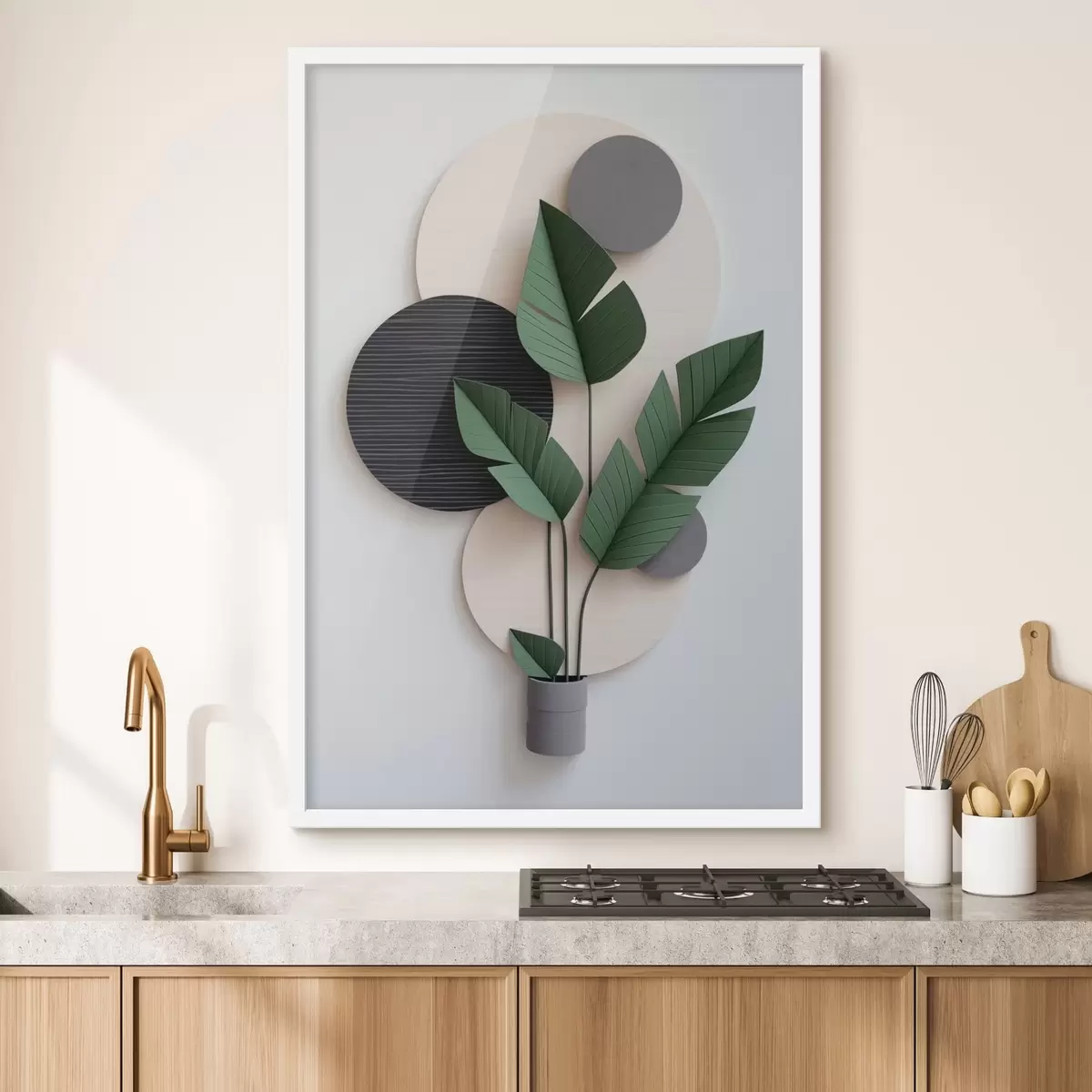 Plakat Minimalistyczny układ z geometrycznymi okręgami i zielonymi liśćmi f48607