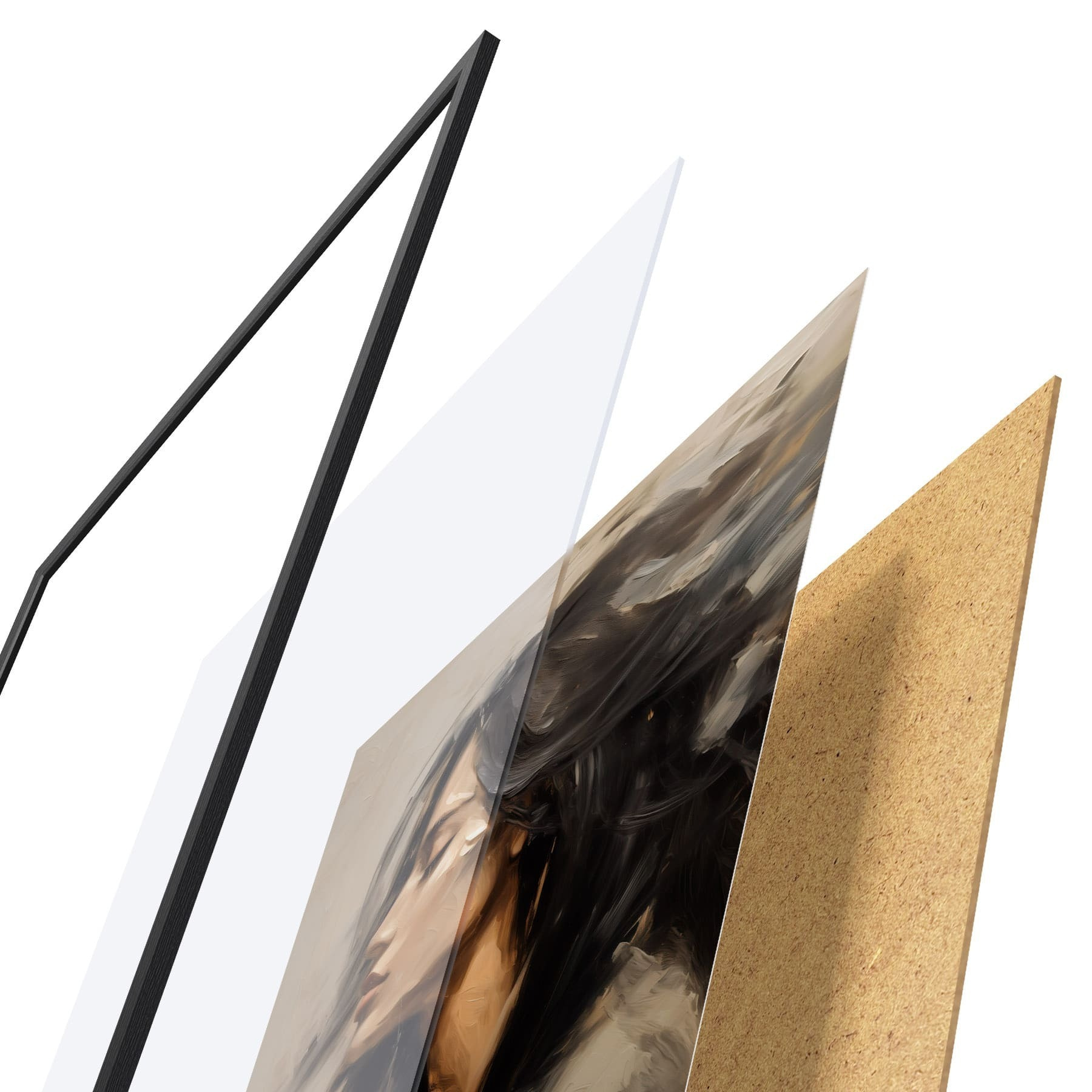 Plakat składa się z ramy, pleksi, wydrukowanego obrazu i podkładu z płyty wiórowej. Plakat można natychmiast zawiesić na ścianie dzięki uchwytom z tyłu.