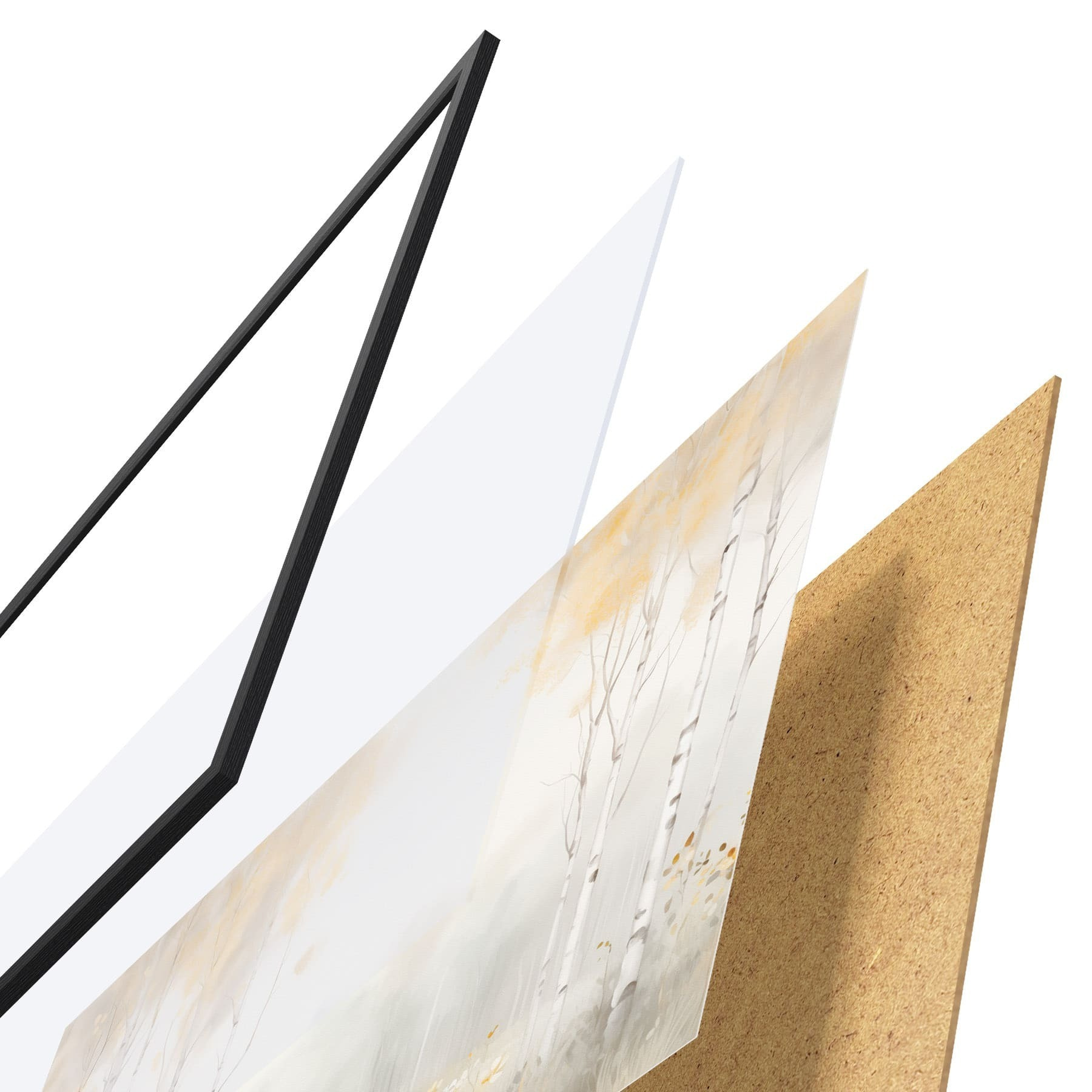 Plakat składa się z ramy, pleksi, wydrukowanego obrazu i podkładu z płyty wiórowej. Plakat można natychmiast zawiesić na ścianie dzięki uchwytom z tyłu.
