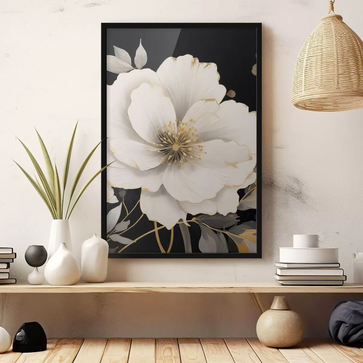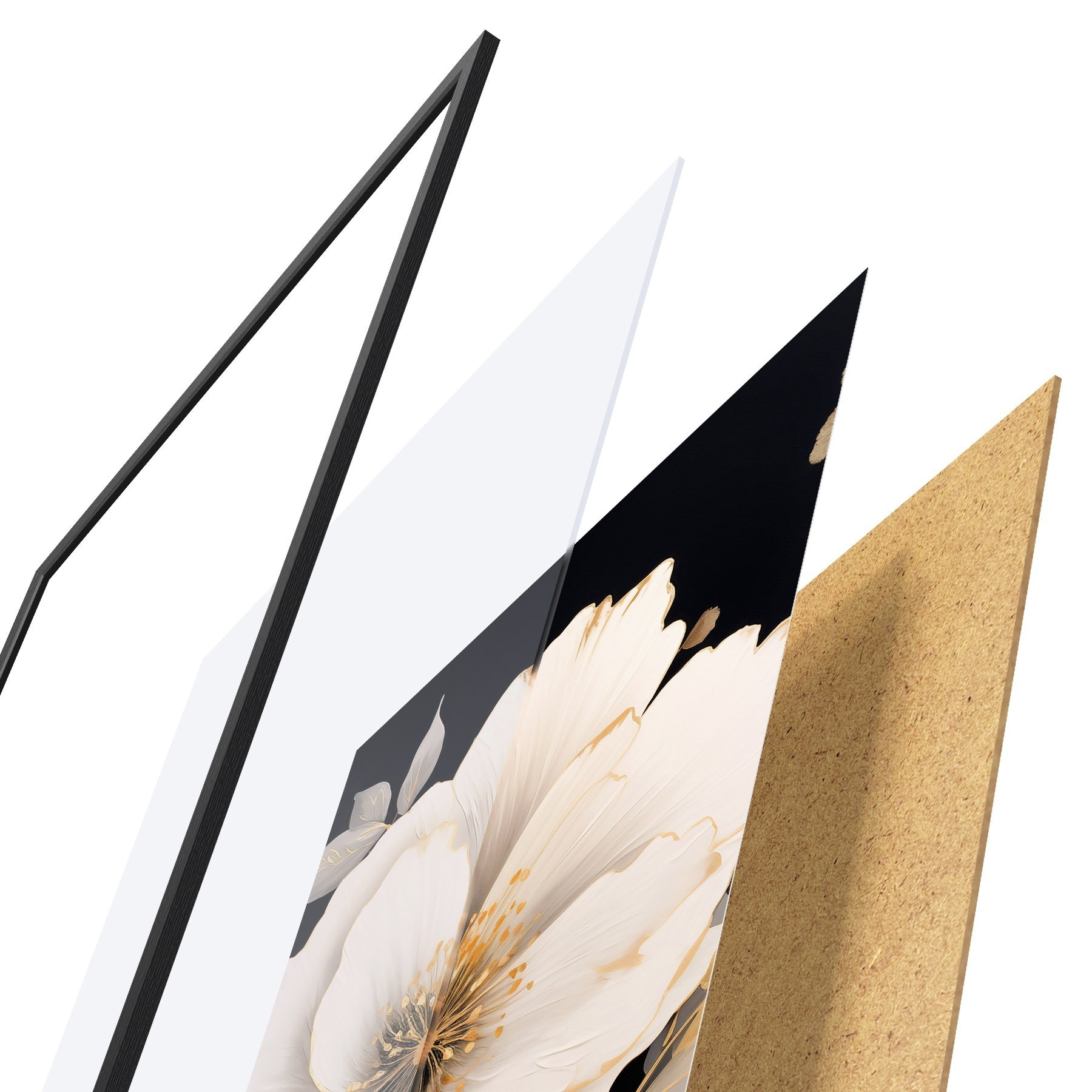 Plakat składa się z ramy, pleksi, wydrukowanego obrazu i podkładu z płyty wiórowej. Plakat można natychmiast zawiesić na ścianie dzięki uchwytom z tyłu.