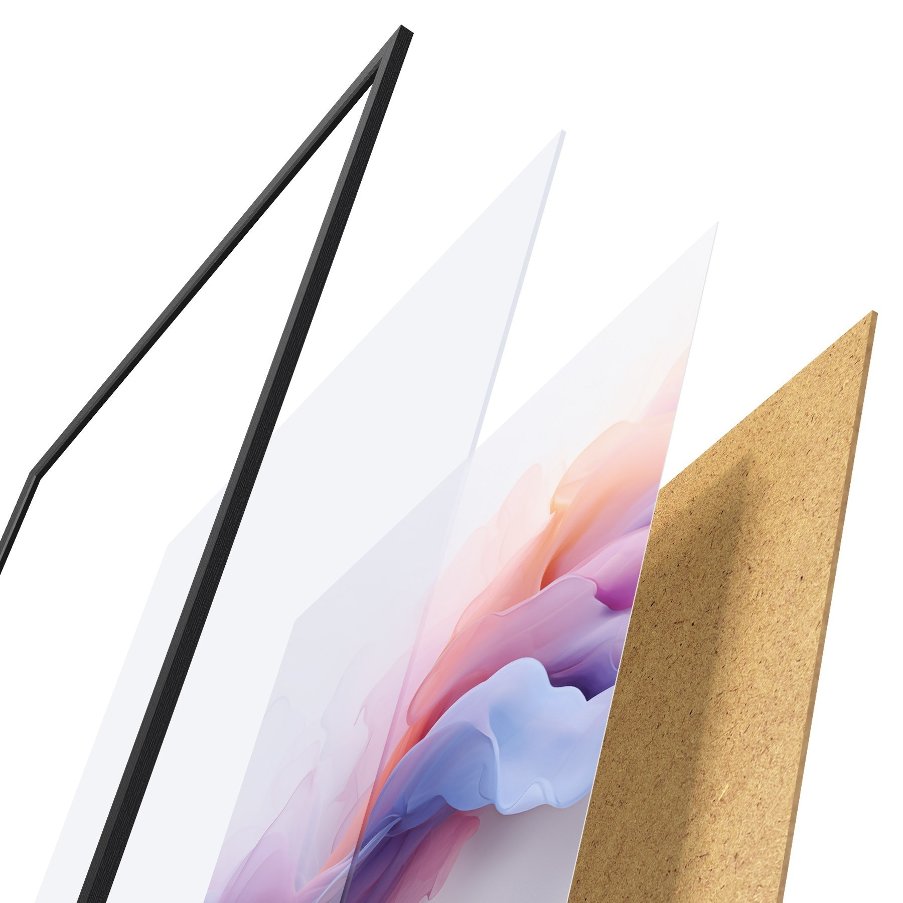 Plakat składa się z ramy, pleksi, wydrukowanego obrazu i podkładu z płyty wiórowej. Plakat można natychmiast zawiesić na ścianie dzięki uchwytom z tyłu.