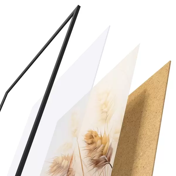 Plakat składa się z ramy, pleksi, wydrukowanego obrazu i podkładu z płyty wiórowej. Plakat można natychmiast zawiesić na ścianie dzięki uchwytom z tyłu.