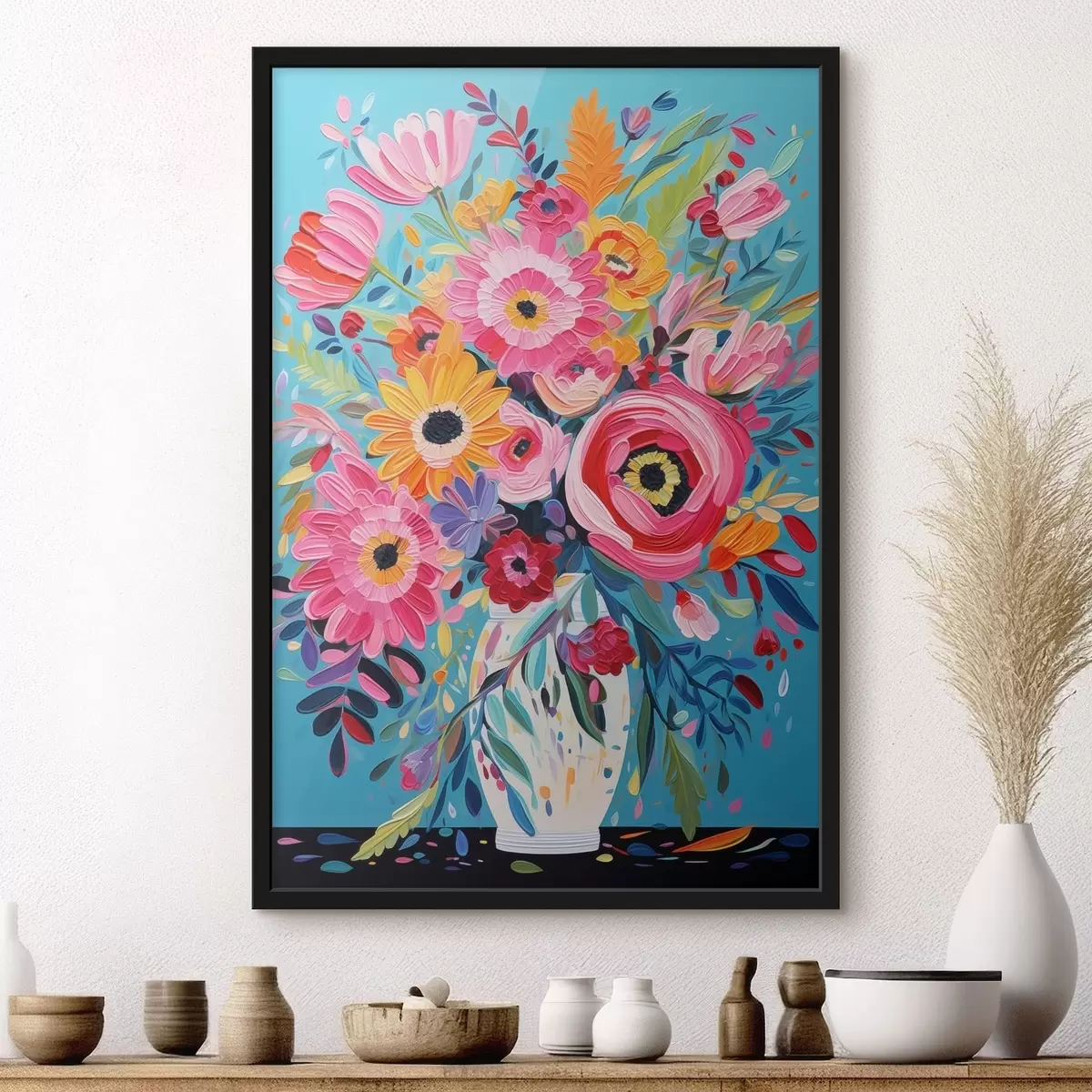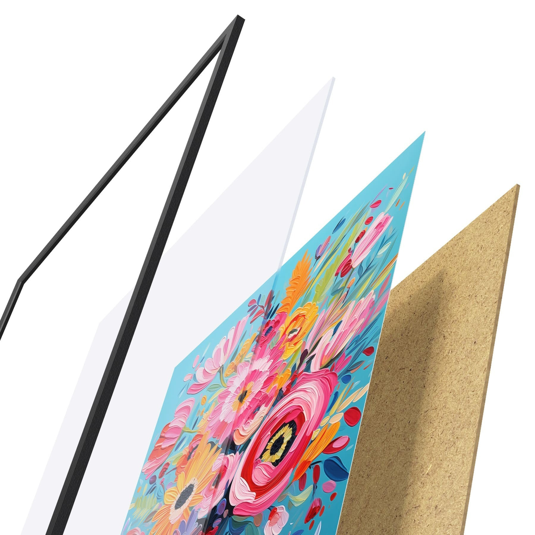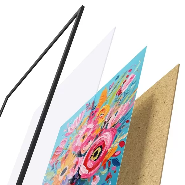 Plakat składa się z ramy, pleksi, wydrukowanego obrazu i podkładu z płyty wiórowej. Plakat można natychmiast zawiesić na ścianie dzięki uchwytom z tyłu.