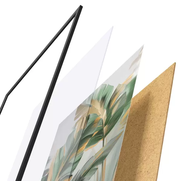 Plakat składa się z ramy, pleksi, wydrukowanego obrazu i podkładu z płyty wiórowej. Plakat można natychmiast zawiesić na ścianie dzięki uchwytom z tyłu.
