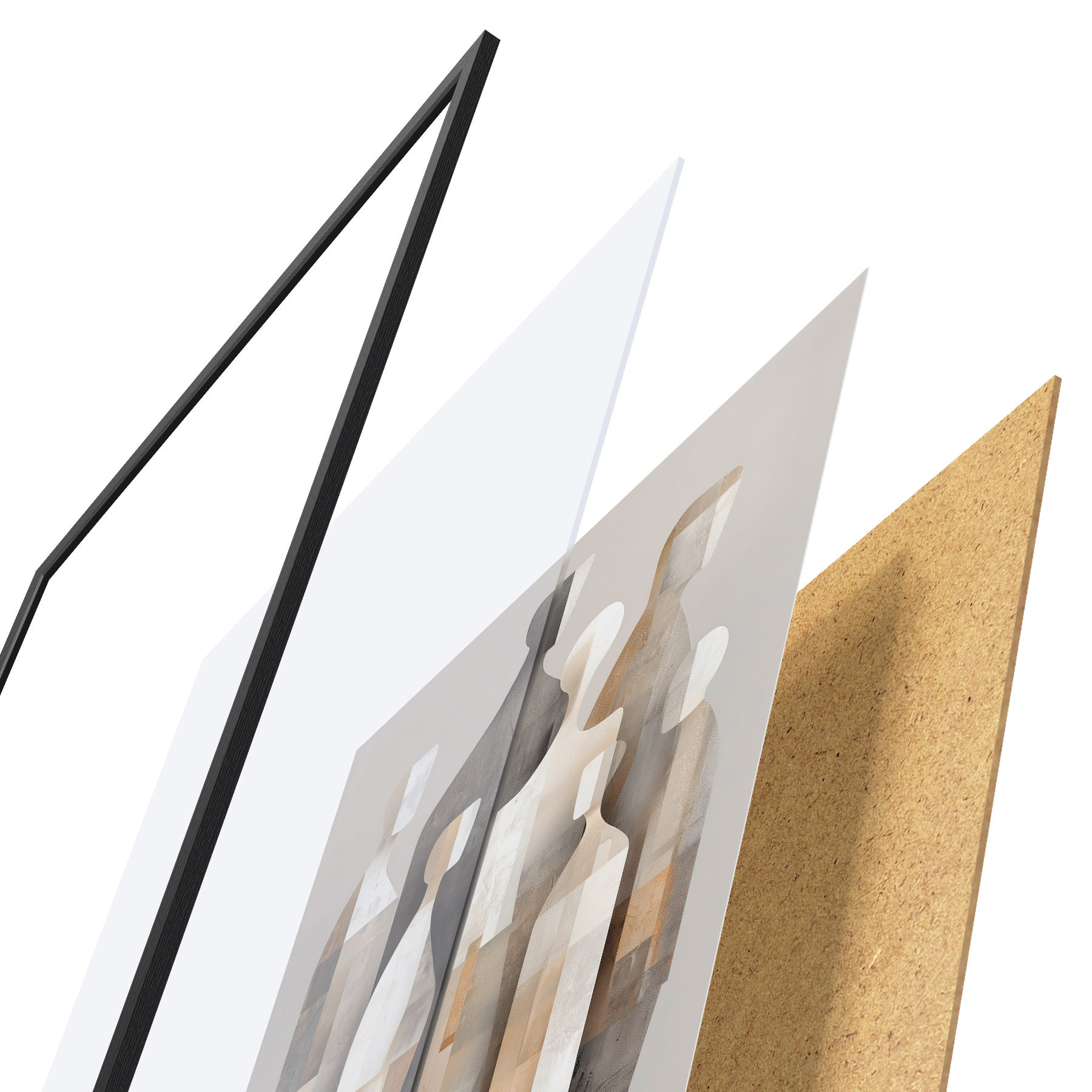 Plakat składa się z ramy, pleksi, wydrukowanego obrazu i podkładu z płyty wiórowej. Plakat można natychmiast zawiesić na ścianie dzięki uchwytom z tyłu.