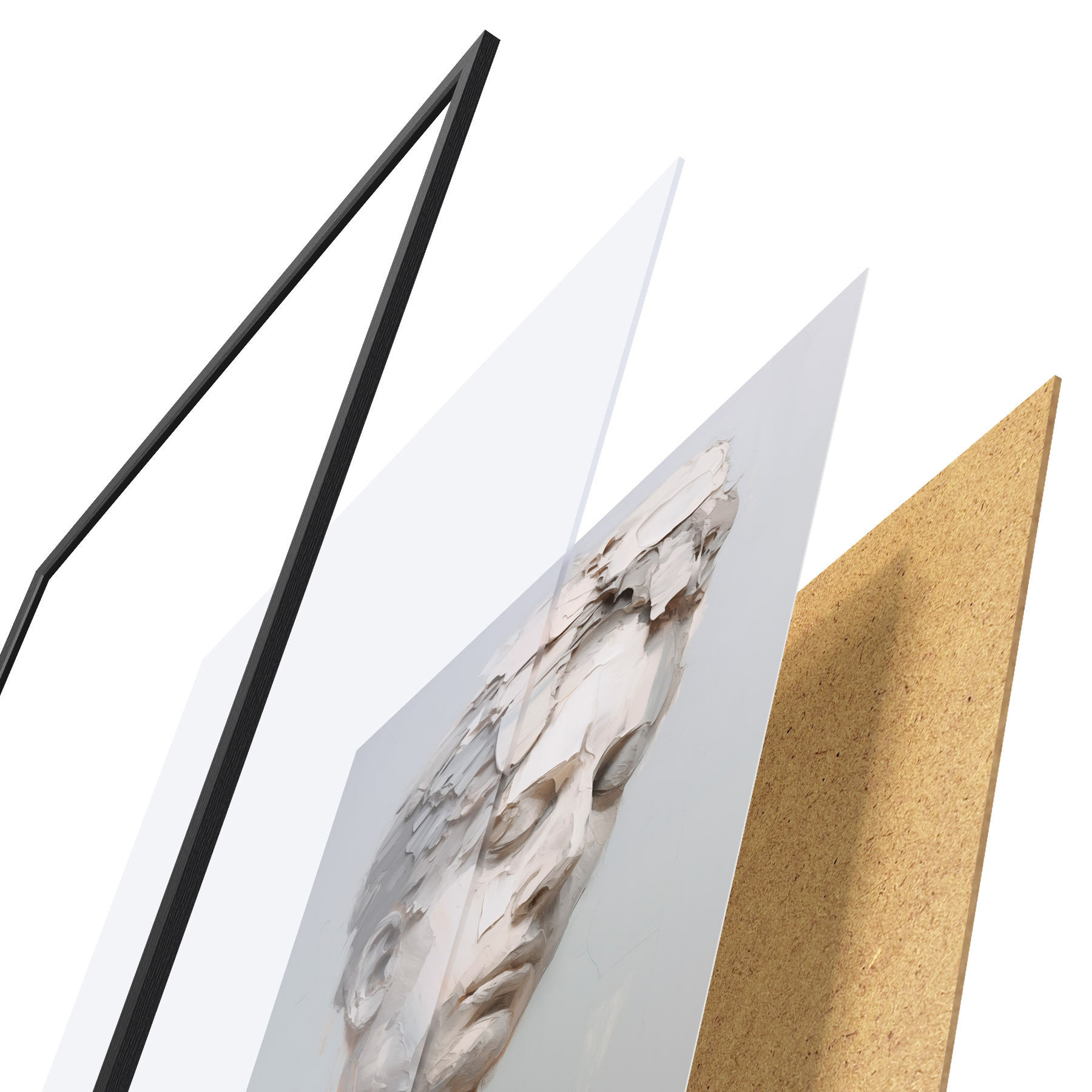 Plakat składa się z ramy, pleksi, wydrukowanego obrazu i podkładu z płyty wiórowej. Plakat można natychmiast zawiesić na ścianie dzięki uchwytom z tyłu.