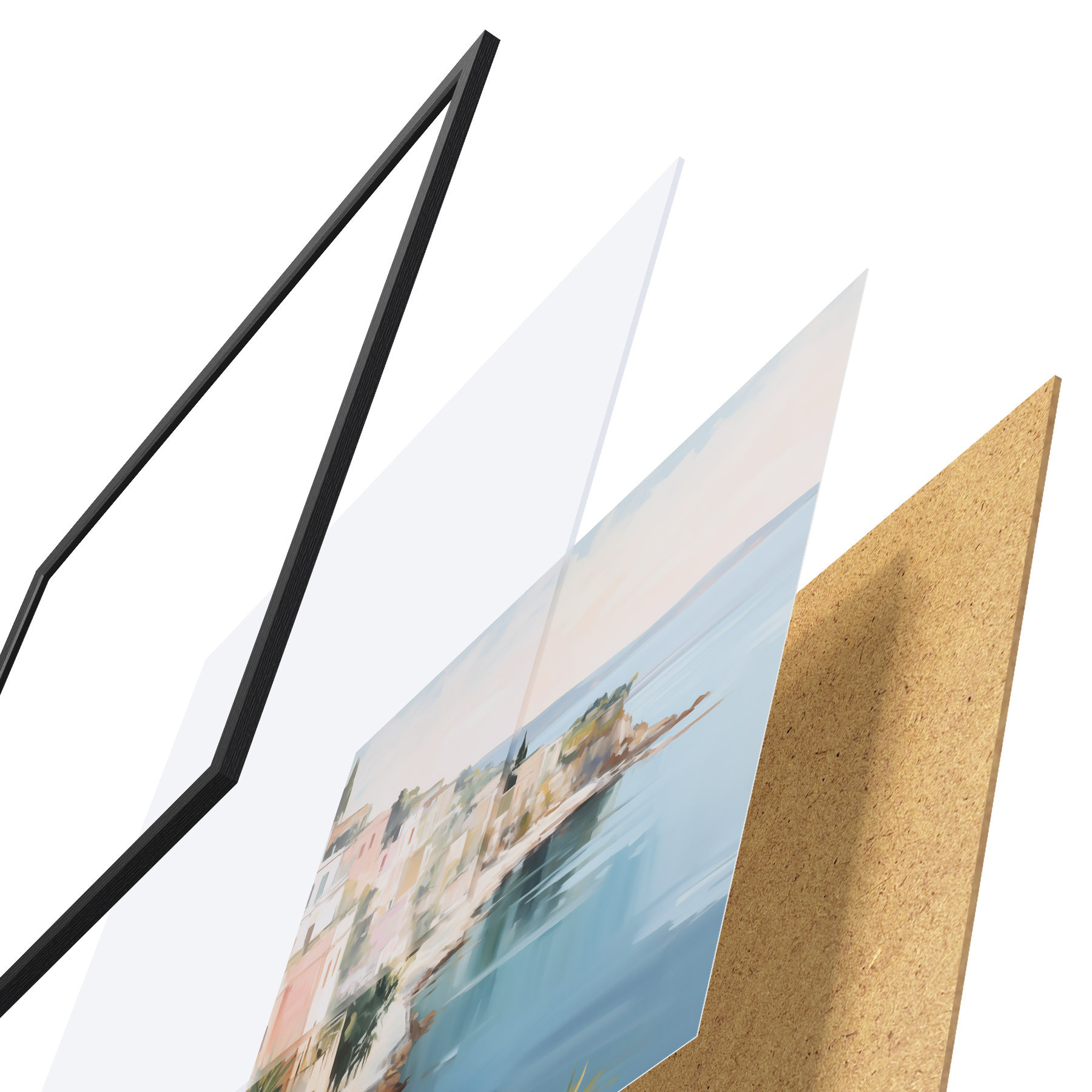 Plakat składa się z ramy, pleksi, wydrukowanego obrazu i podkładu z płyty wiórowej. Plakat można natychmiast zawiesić na ścianie dzięki uchwytom z tyłu.