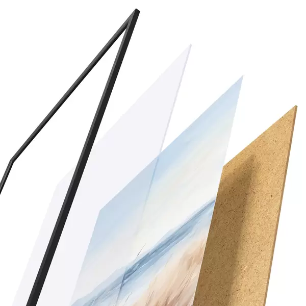 Plakat składa się z ramy, pleksi, wydrukowanego obrazu i podkładu z płyty wiórowej. Plakat można natychmiast zawiesić na ścianie dzięki uchwytom z tyłu.