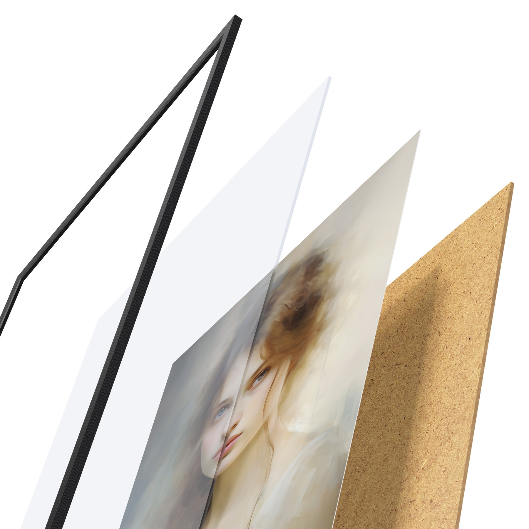 Plakat składa się z ramy, pleksi, wydrukowanego obrazu i podkładu z płyty wiórowej. Plakat można natychmiast zawiesić na ścianie dzięki uchwytom z tyłu.