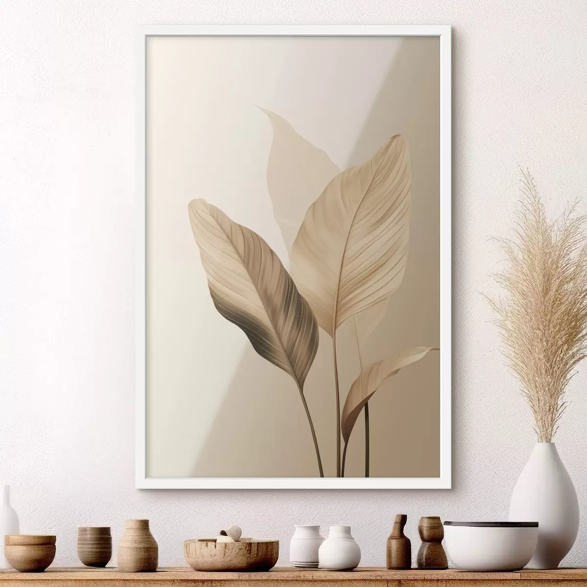 Plakat Duże tropikalne liście w odcieniach beżu i brązu, jasne tło f48726