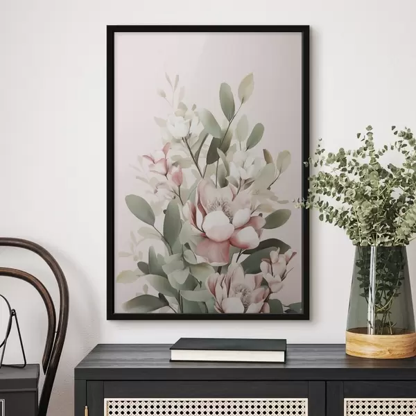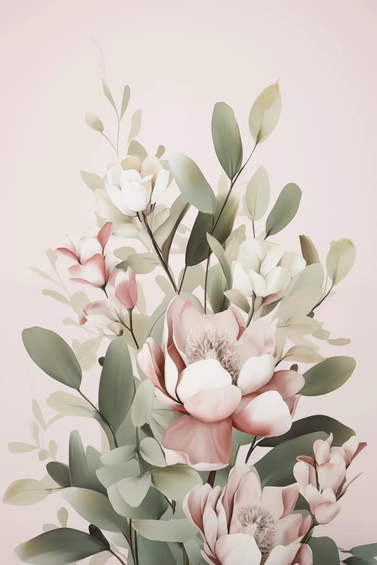Poster Bukiet pastelowych kwiatów z liśćmi eukaliptusa na jasnoróżowym tle Nr f48727