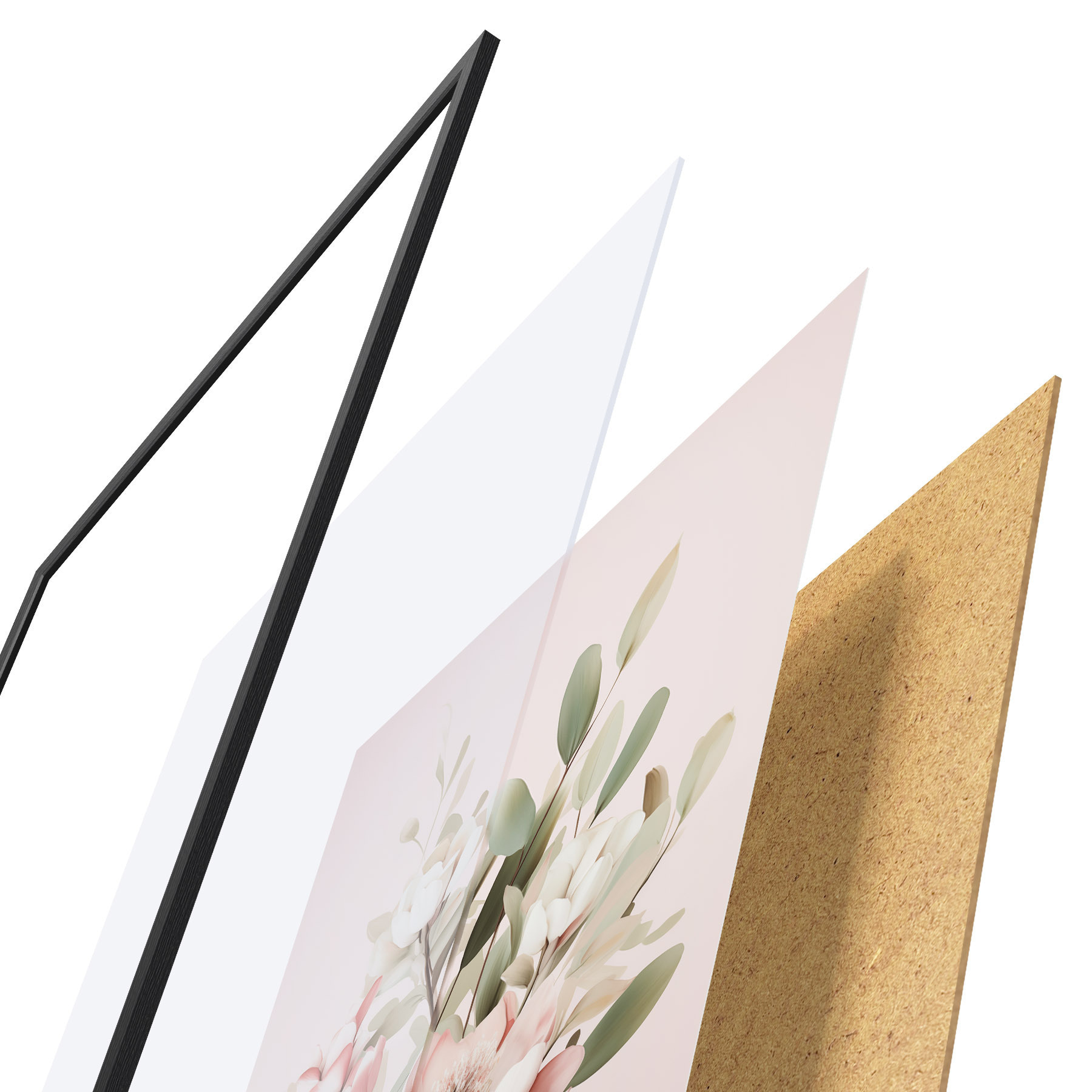 Plakat składa się z ramy, pleksi, wydrukowanego obrazu i podkładu z płyty wiórowej. Plakat można natychmiast zawiesić na ścianie dzięki uchwytom z tyłu.