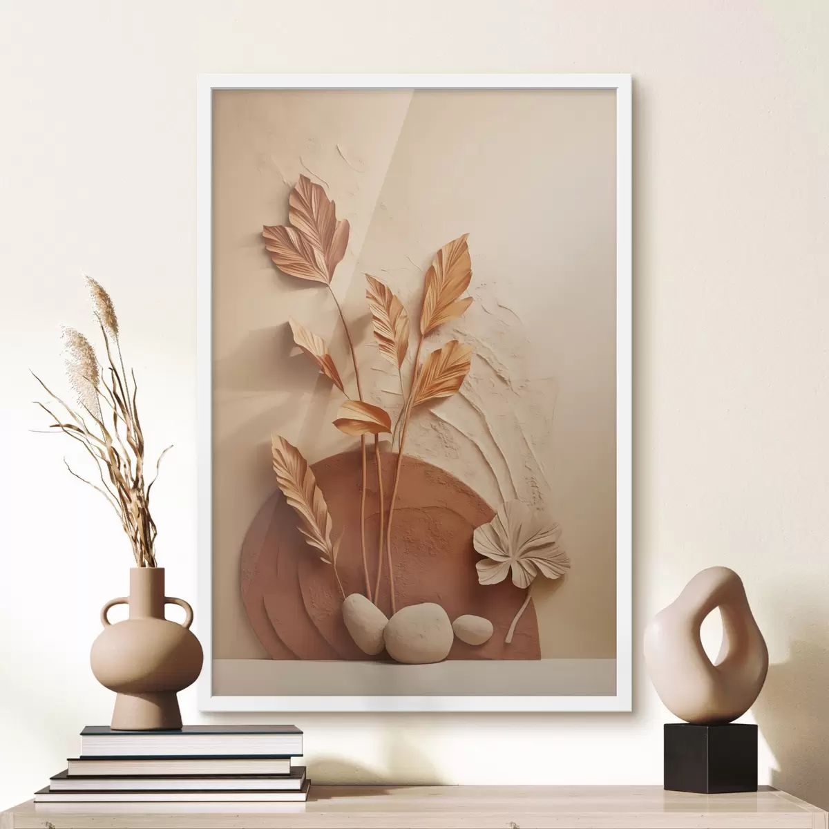 Plakat Minimalistyczna kompozycja z suszonymi kwiatami i trawą pampasową na teksturowanym tle f48740