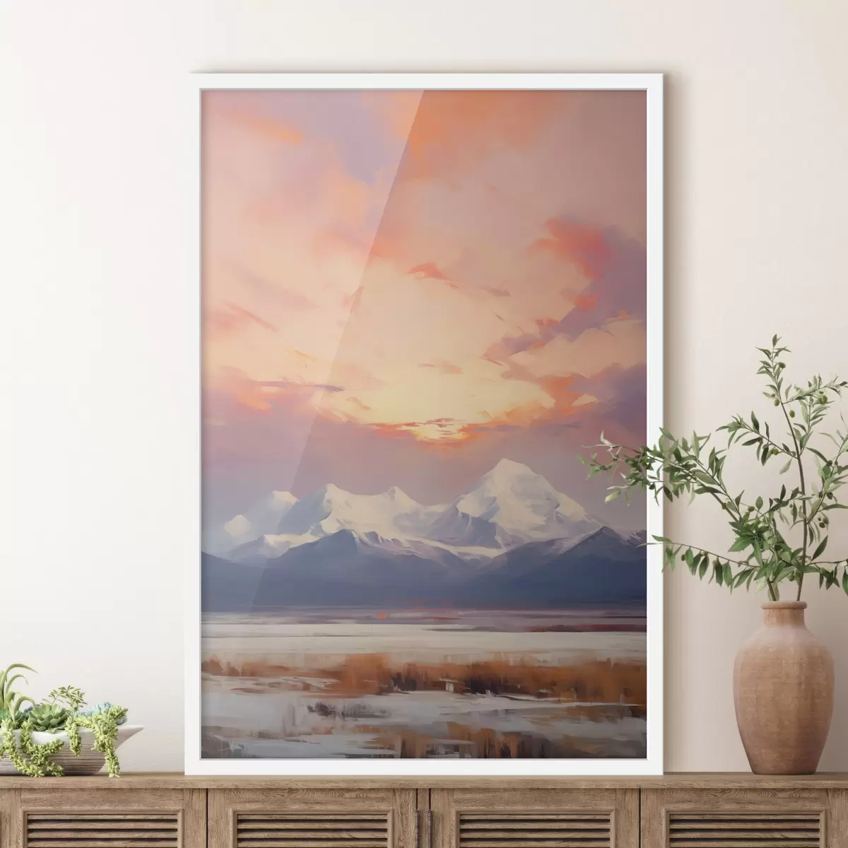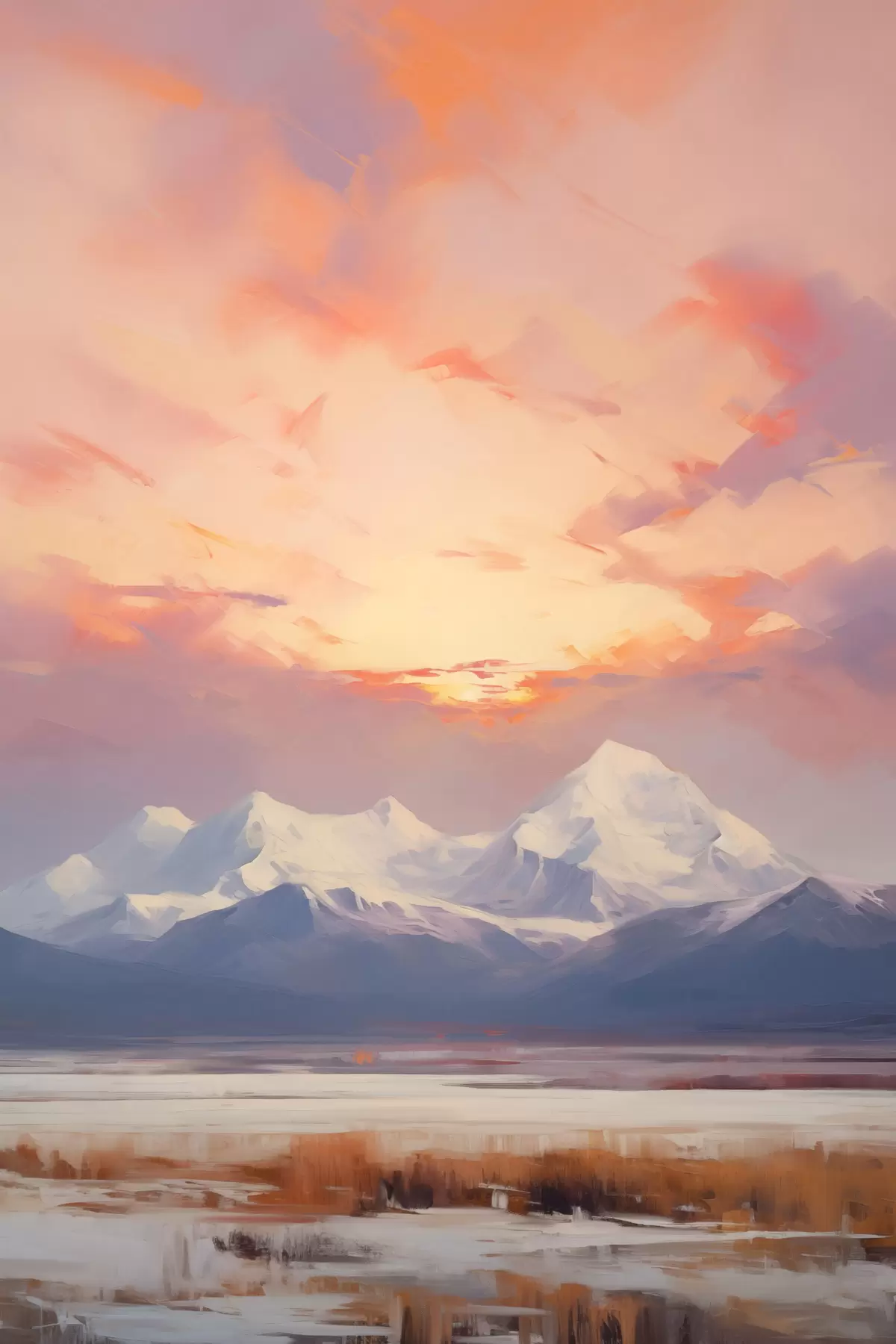Plakat Ośnieżone szczyty górskie na tle intensywnie pomarańczowo-różowego nieba z chmurami f48742