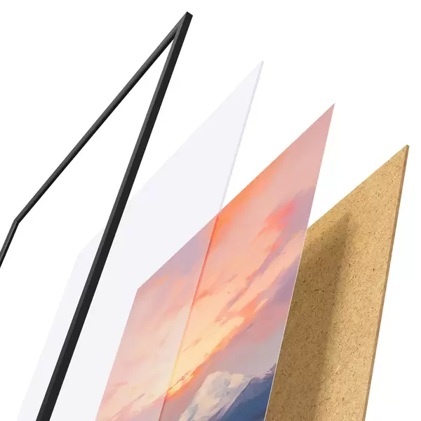 Plakat składa się z ramy, pleksi, wydrukowanego obrazu i podkładu z płyty wiórowej. Plakat można natychmiast zawiesić na ścianie dzięki uchwytom z tyłu.