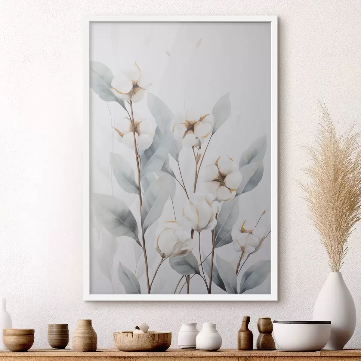 Plakat Biała roślina bawełny z jasnoniebiesko-zielonymi liśćmi na jasnym tle f48744