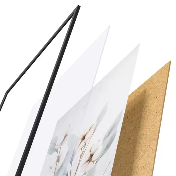 Plakat składa się z ramy, pleksi, wydrukowanego obrazu i podkładu z płyty wiórowej. Plakat można natychmiast zawiesić na ścianie dzięki uchwytom z tyłu.