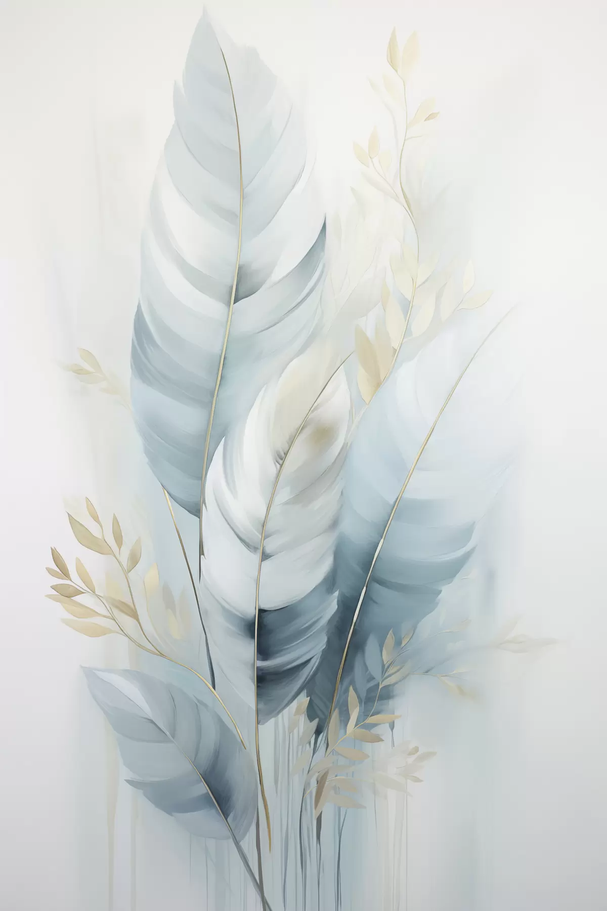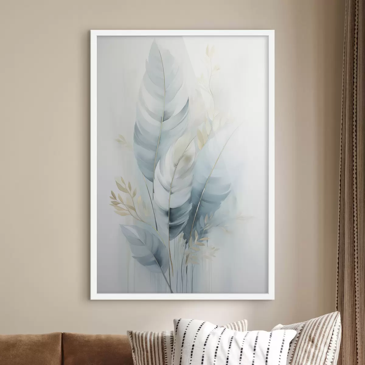 Plakat Duże, miękkie pióra w odcieniach błękitu i bieli z delikatnymi beżowymi liśćmi f48749