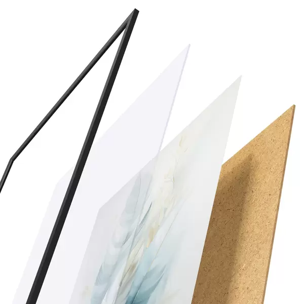 Plakat składa się z ramy, pleksi, wydrukowanego obrazu i podkładu z płyty wiórowej. Plakat można natychmiast zawiesić na ścianie dzięki uchwytom z tyłu.
