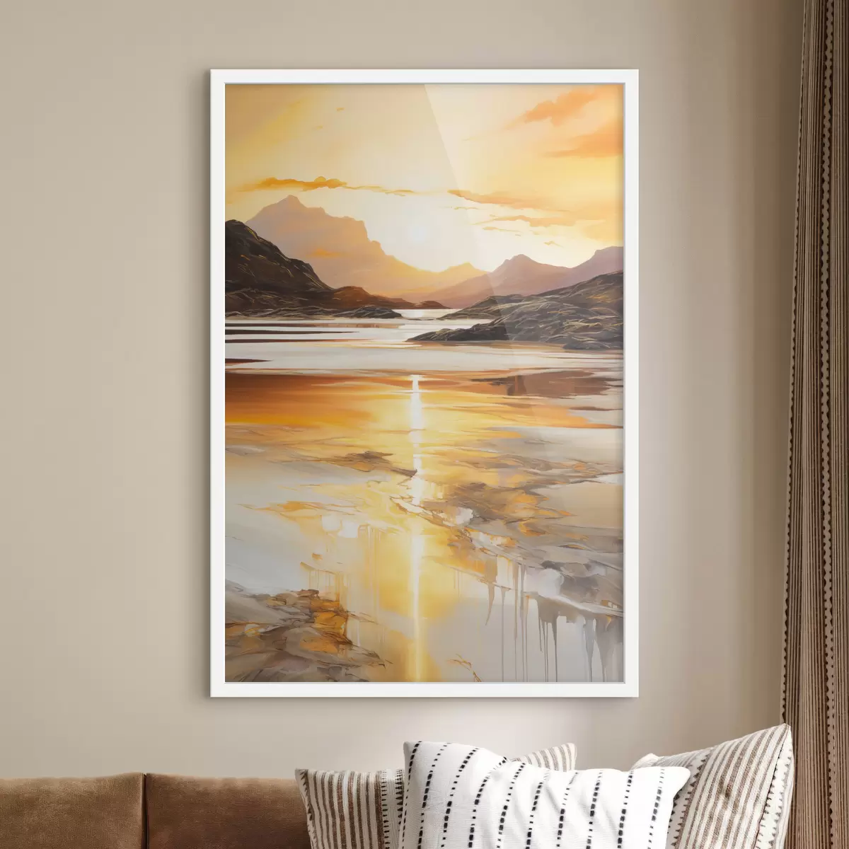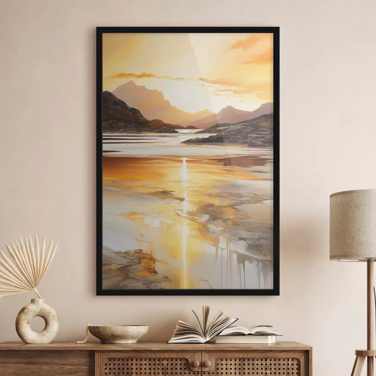 Plakat Krajobraz z rzeką i górami pod ciepłym, pomarańczowym niebem o zachodzie słońca f48755