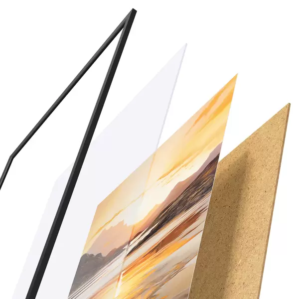 Plakat składa się z ramy, pleksi, wydrukowanego obrazu i podkładu z płyty wiórowej. Plakat można natychmiast zawiesić na ścianie dzięki uchwytom z tyłu.