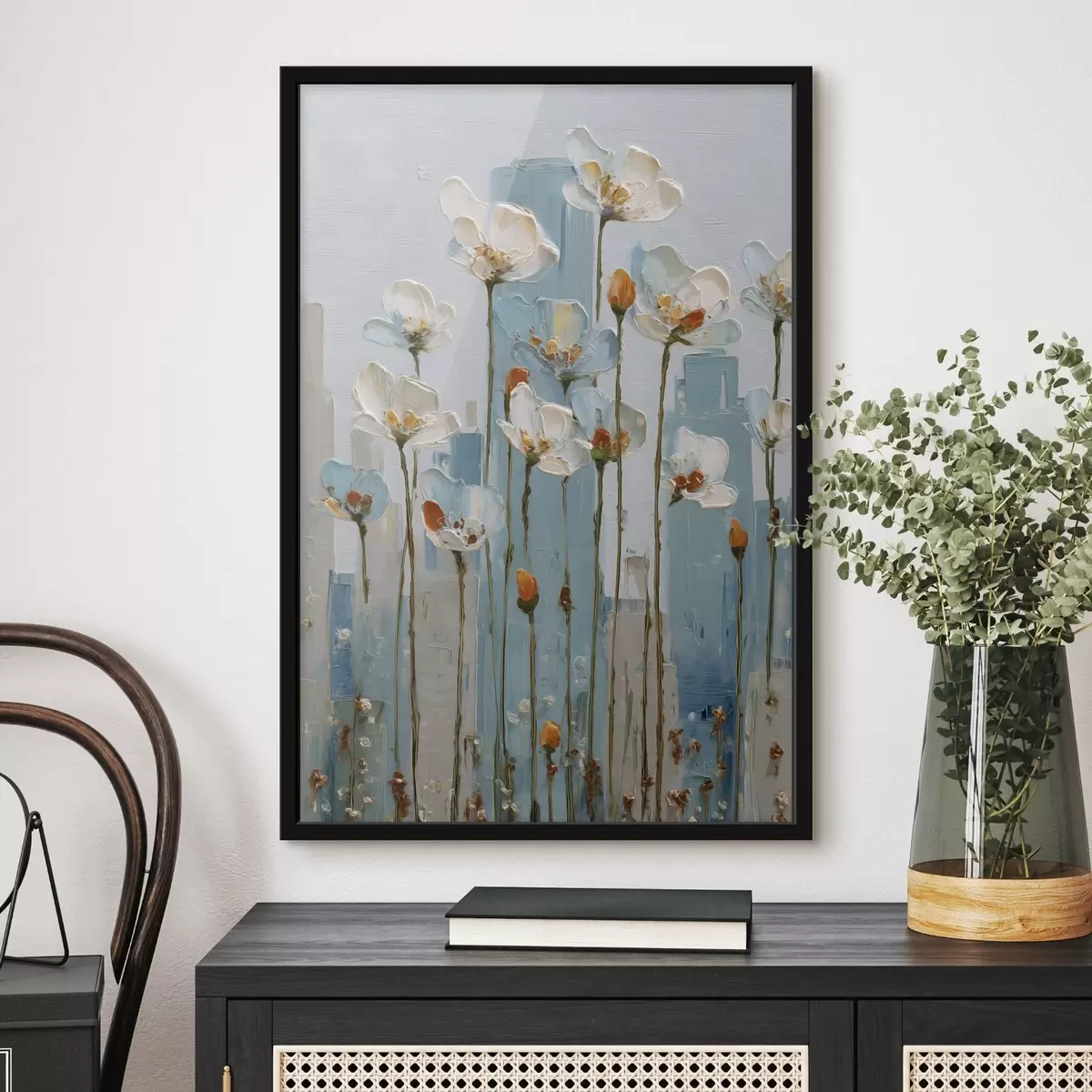 Plakat kwiaty na tle miasta, w stylu malarstwa olejnego f48785