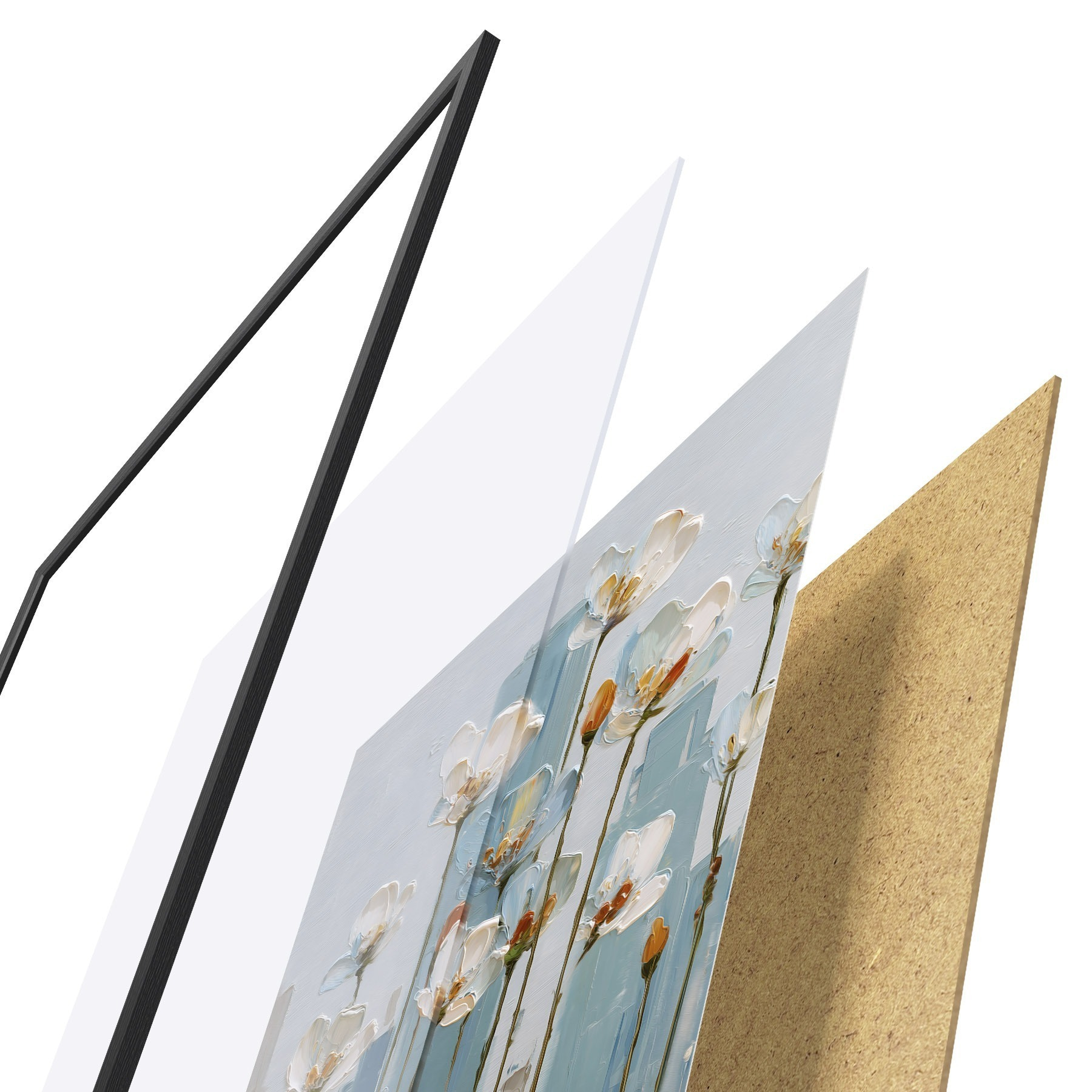 Plakat składa się z ramy, pleksi, wydrukowanego obrazu i podkładu z płyty wiórowej. Plakat można natychmiast zawiesić na ścianie dzięki uchwytom z tyłu.