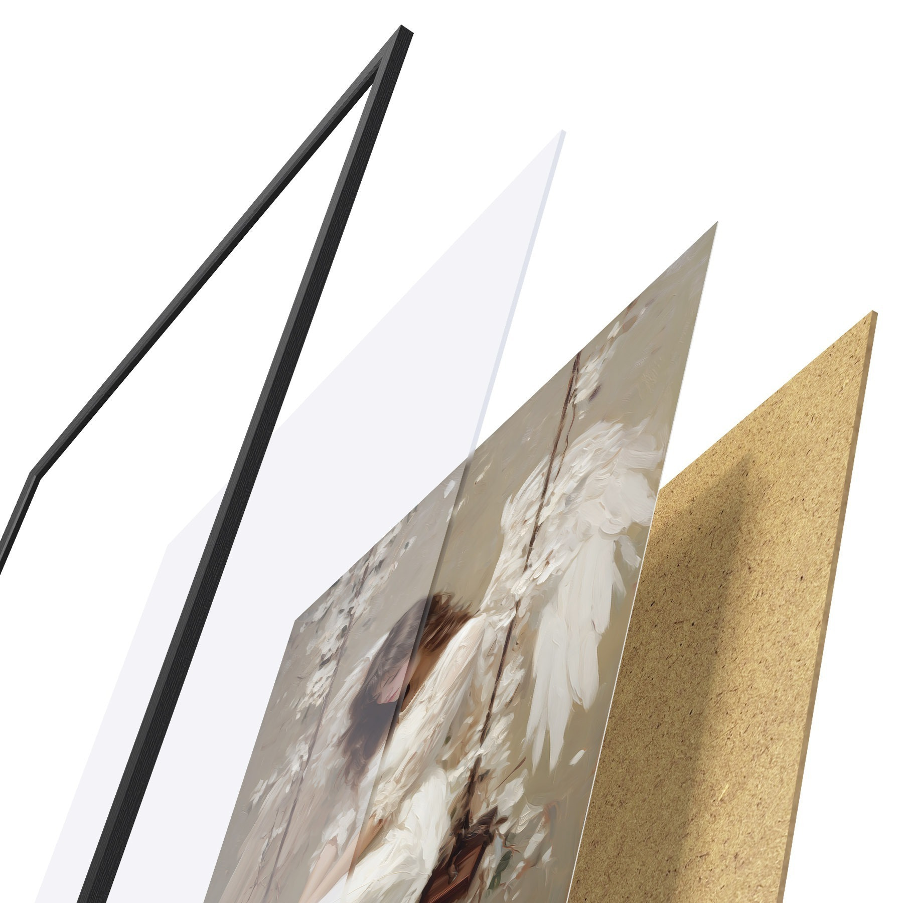 Plakat składa się z ramy, pleksi, wydrukowanego obrazu i podkładu z płyty wiórowej. Plakat można natychmiast zawiesić na ścianie dzięki uchwytom z tyłu.