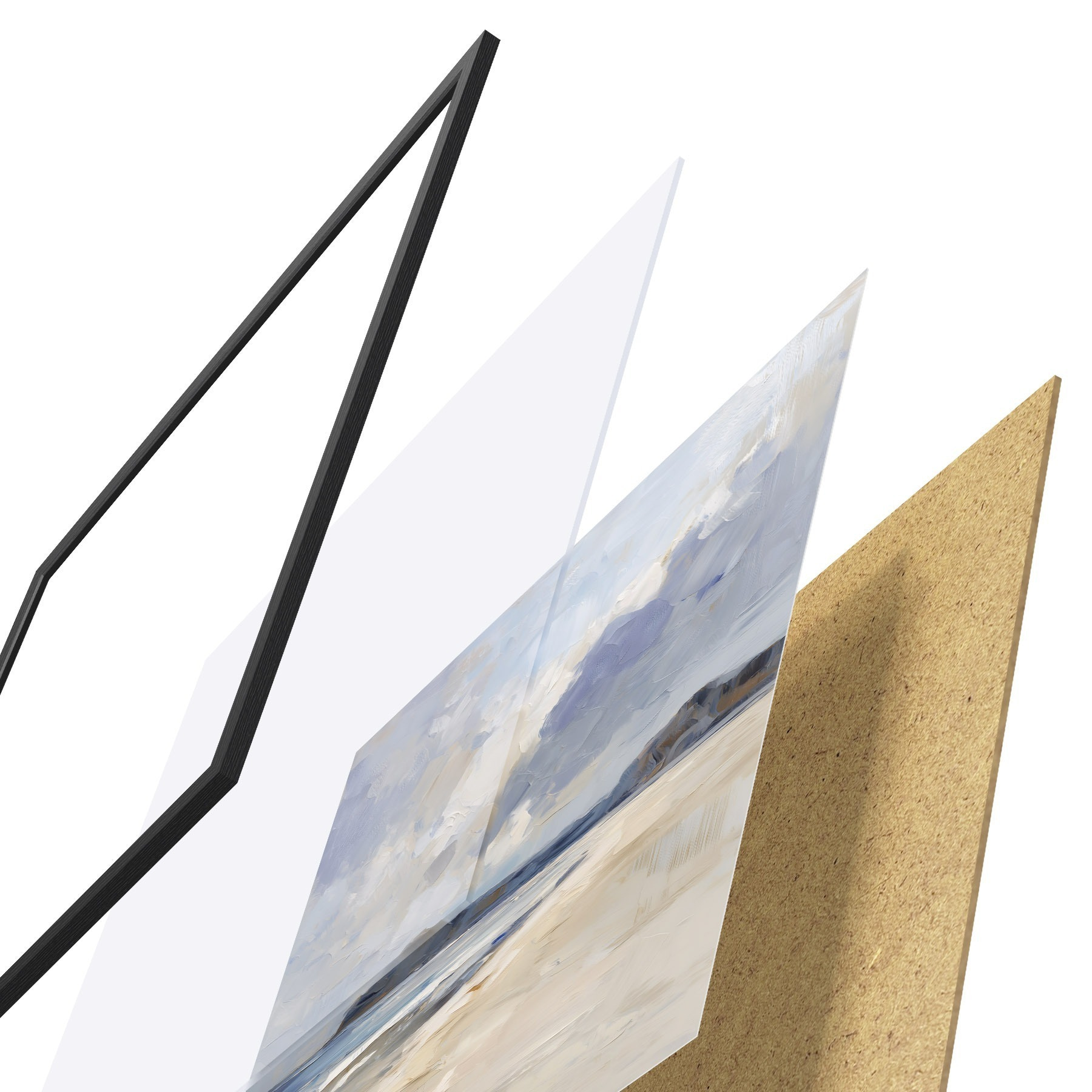 Plakat składa się z ramy, pleksi, wydrukowanego obrazu i podkładu z płyty wiórowej. Plakat można natychmiast zawiesić na ścianie dzięki uchwytom z tyłu.