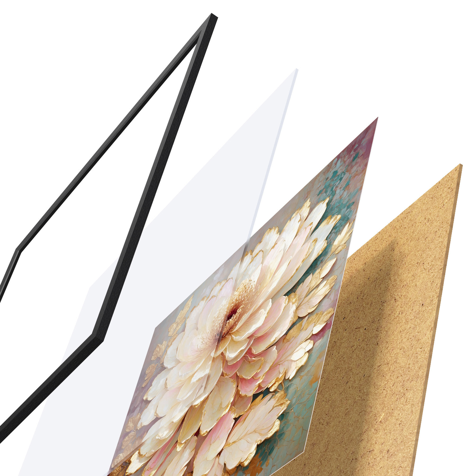 Plakat składa się z ramy, pleksi, wydrukowanego obrazu i podkładu z płyty wiórowej. Plakat można natychmiast zawiesić na ścianie dzięki uchwytom z tyłu.