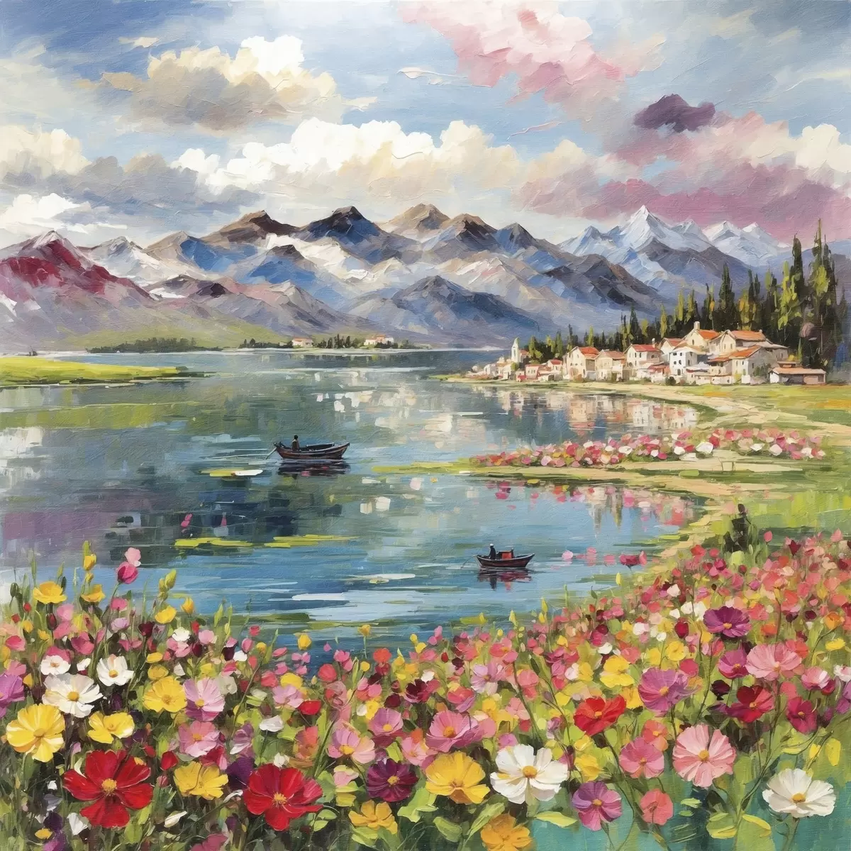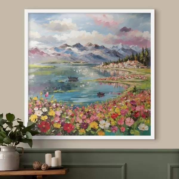 Plakat Impresjonistyczny obraz przedstawiający górskie jezioro z łodziami i kwiatami f48806