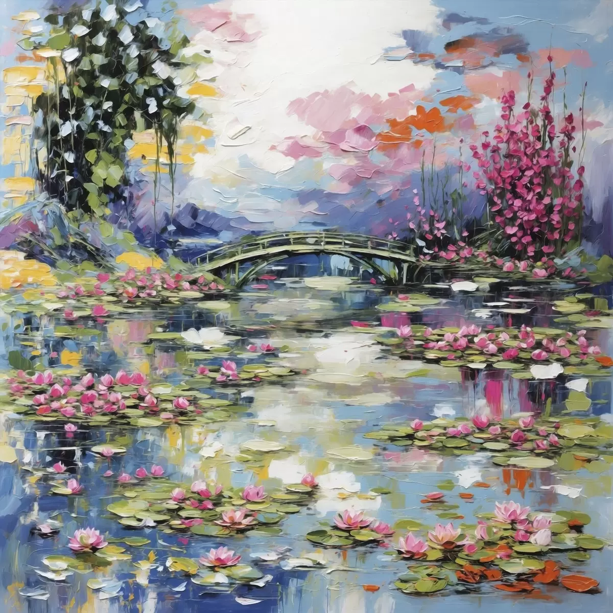 Poster Impresjonistyczny most nad stawem z liliami wodnymi i kwiatami Nr f48807