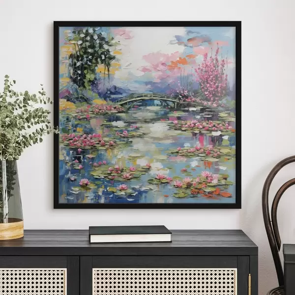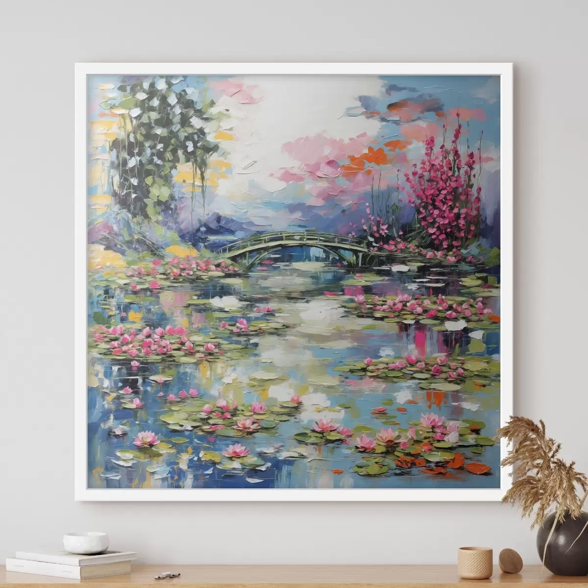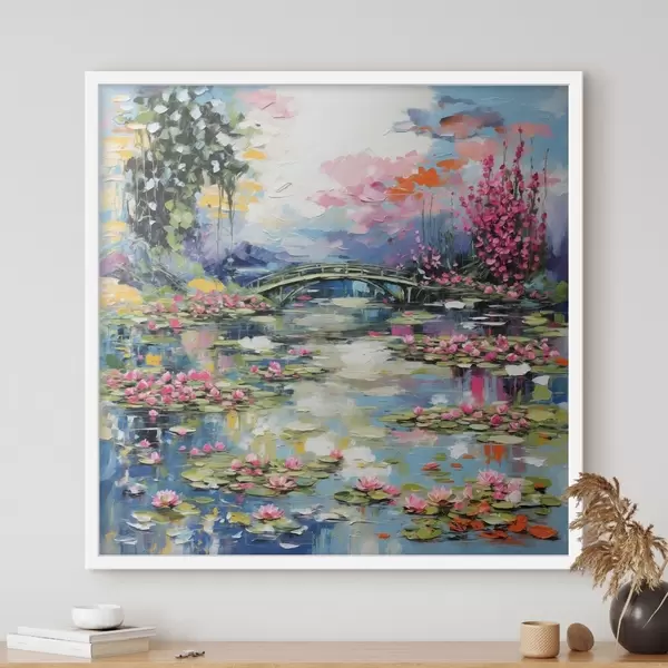 Plakat Impresjonistyczny most nad stawem z liliami wodnymi i kwiatami f48807