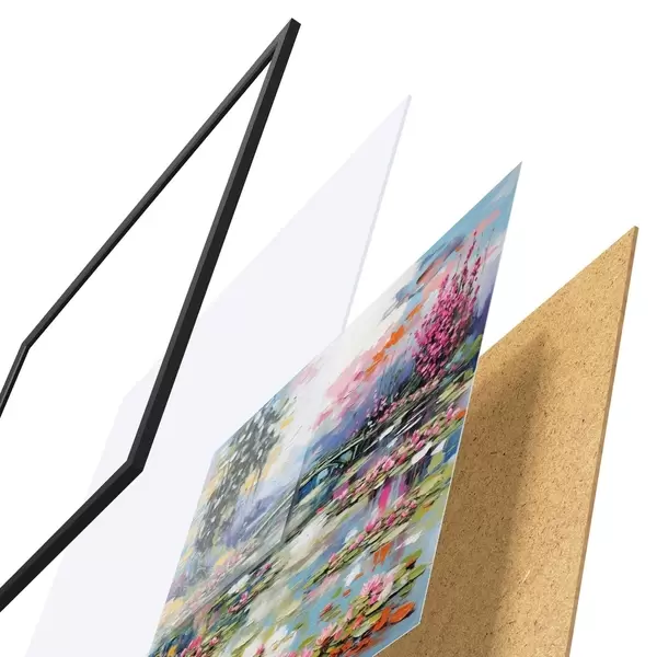Plakat składa się z ramy, pleksi, wydrukowanego obrazu i podkładu z płyty wiórowej. Plakat można natychmiast zawiesić na ścianie dzięki uchwytom z tyłu.