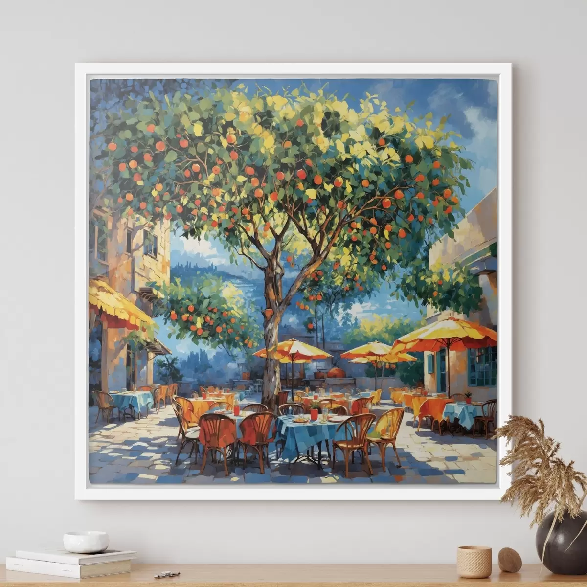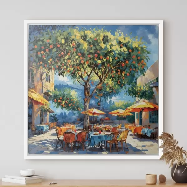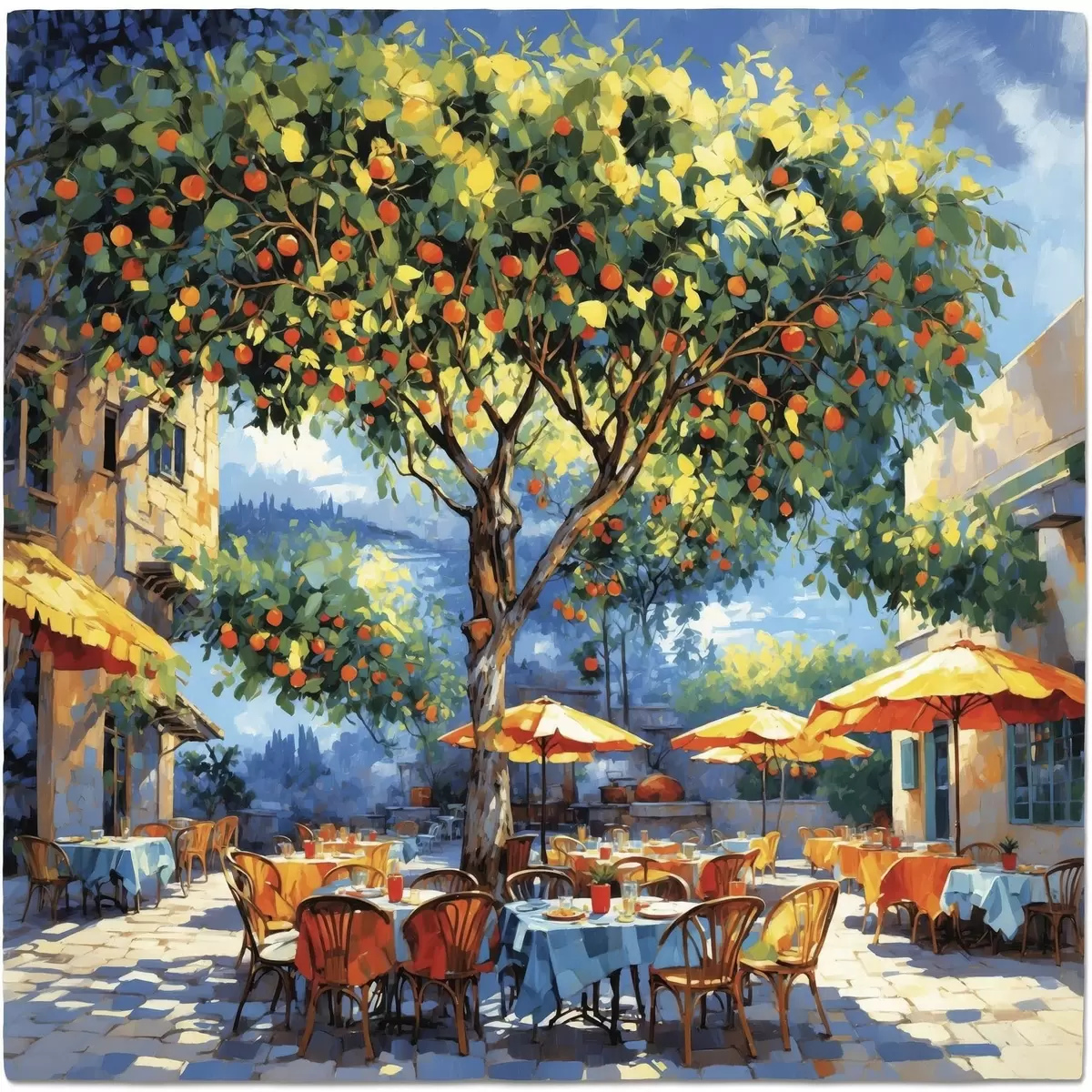 Plakat Dziedziniec kawiarni w stylu impresjonistycznym z drzewem i parasolami f48811