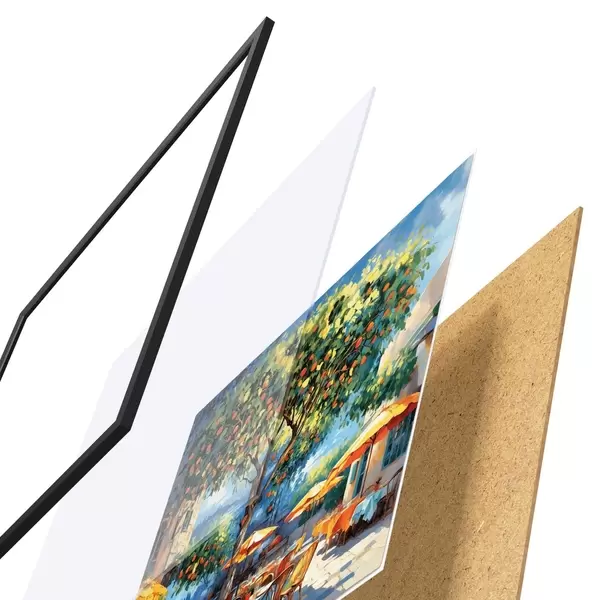 Plakat składa się z ramy, pleksi, wydrukowanego obrazu i podkładu z płyty wiórowej. Plakat można natychmiast zawiesić na ścianie dzięki uchwytom z tyłu.