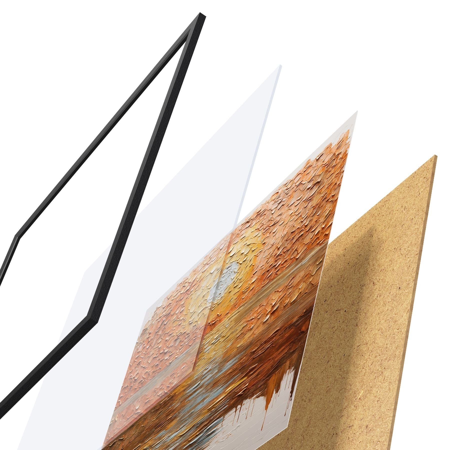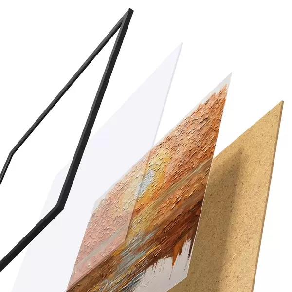 Plakat składa się z ramy, pleksi, wydrukowanego obrazu i podkładu z płyty wiórowej. Plakat można natychmiast zawiesić na ścianie dzięki uchwytom z tyłu.