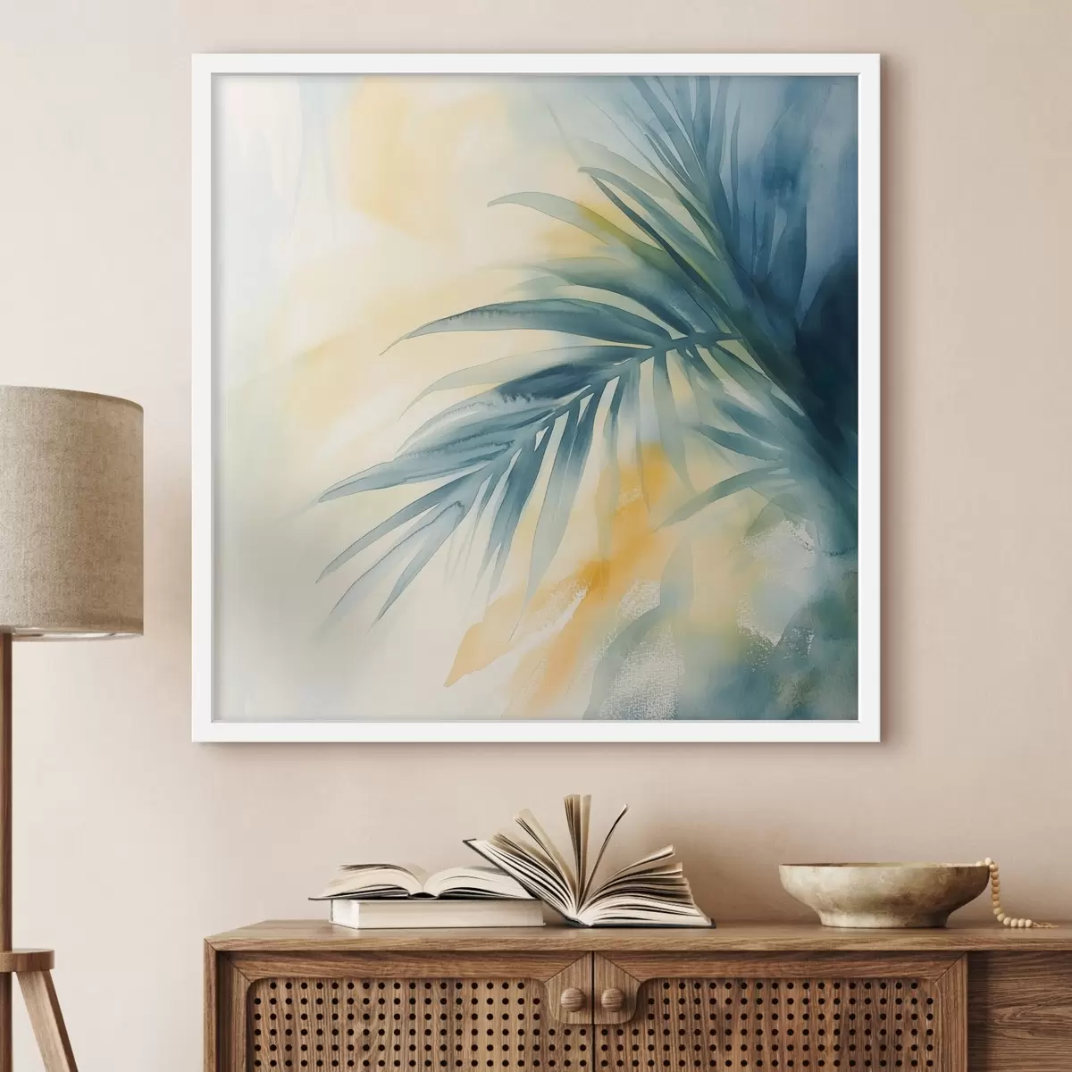 Plakat Tropikalne liście palmowe w niebiesko-turkusowej kolorystyce na tle ciepłych plam akwareli f48849