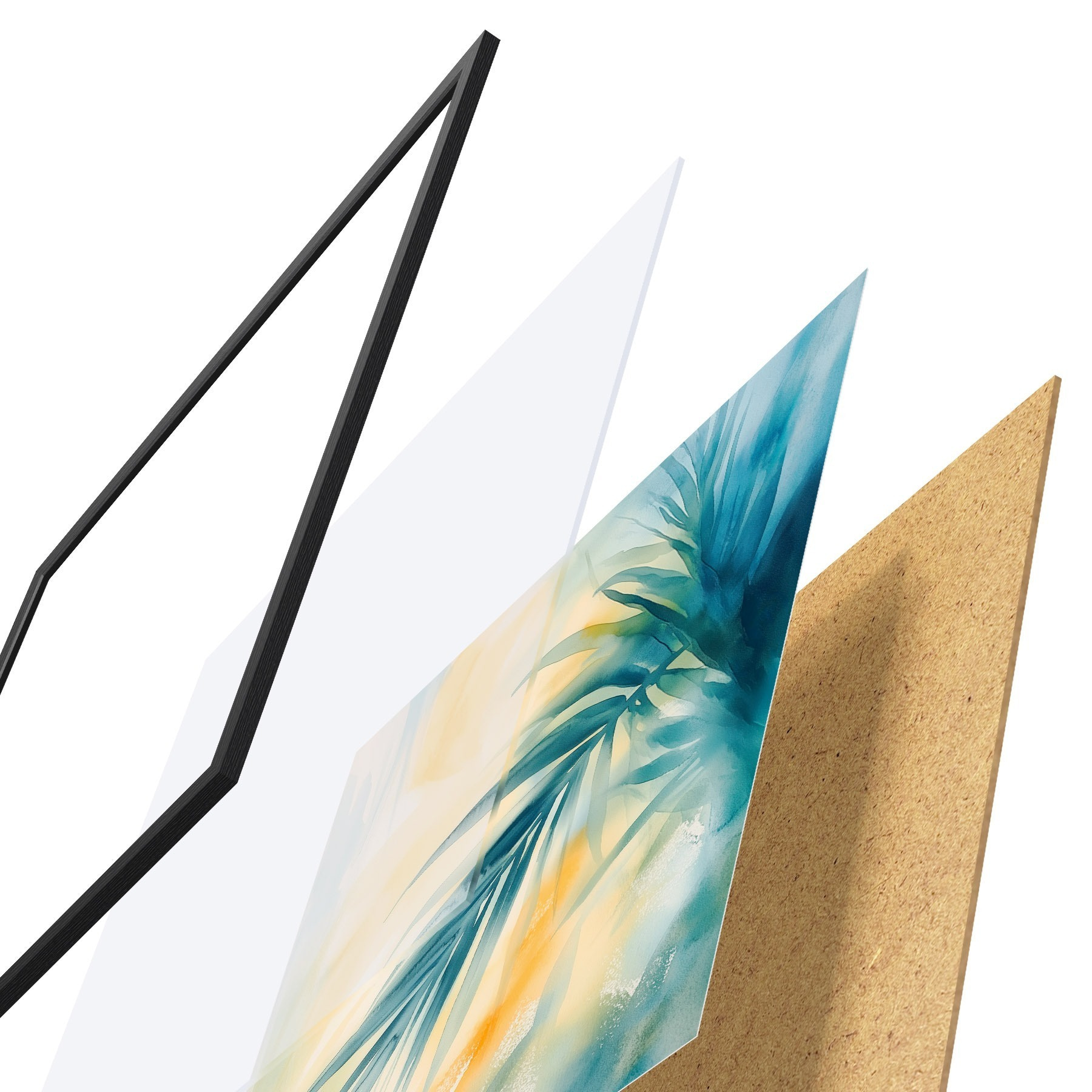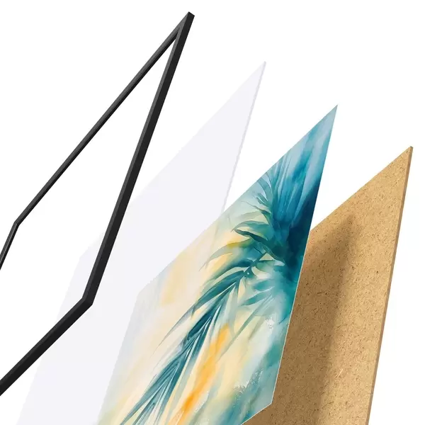 Plakat składa się z ramy, pleksi, wydrukowanego obrazu i podkładu z płyty wiórowej. Plakat można natychmiast zawiesić na ścianie dzięki uchwytom z tyłu.
