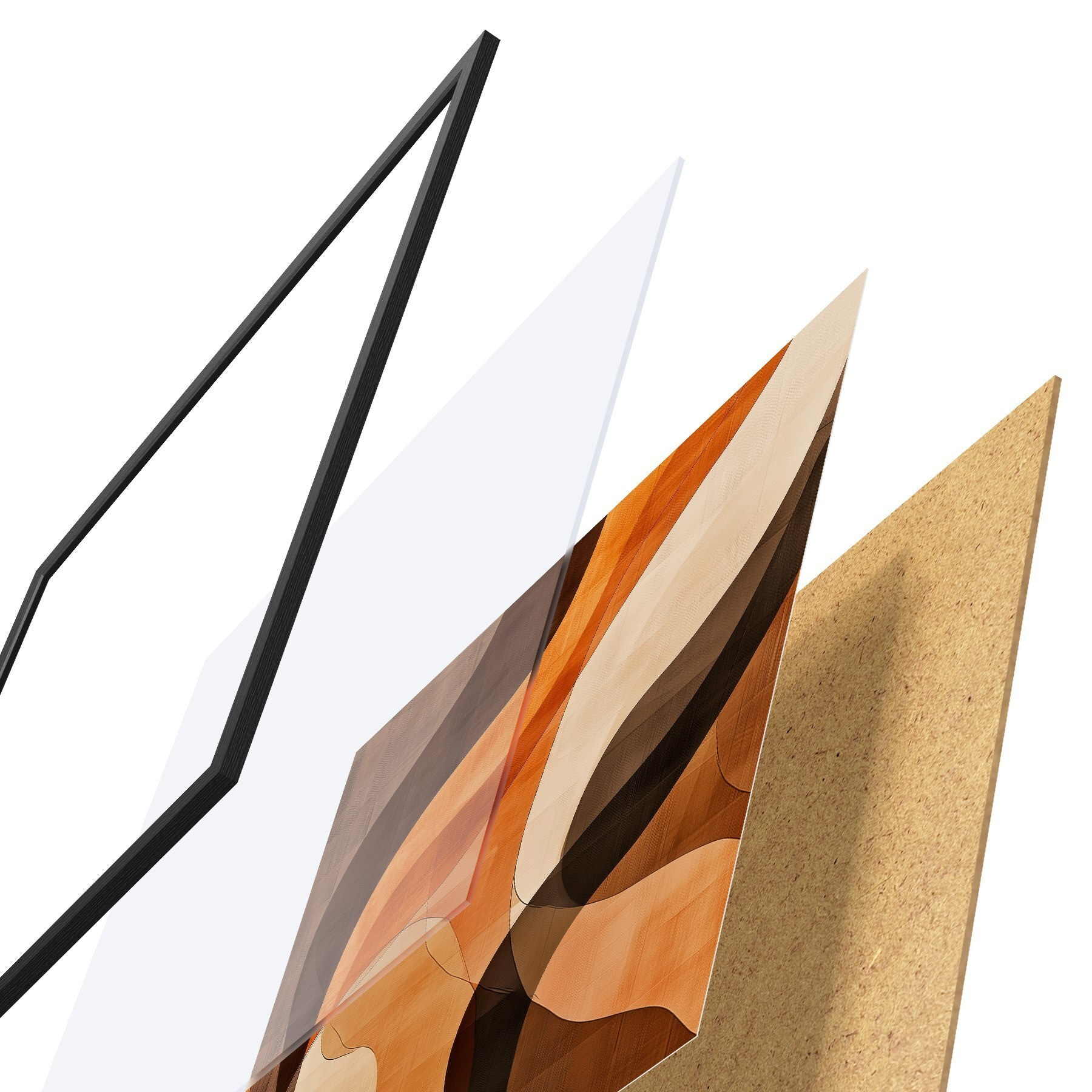 Plakat składa się z ramy, pleksi, wydrukowanego obrazu i podkładu z płyty wiórowej. Plakat można natychmiast zawiesić na ścianie dzięki uchwytom z tyłu.