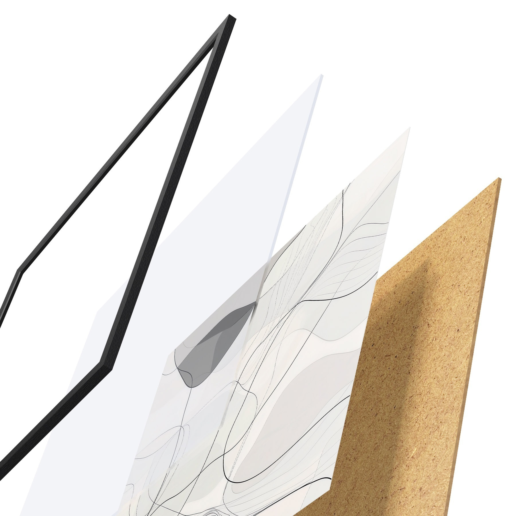 Plakat składa się z ramy, pleksi, wydrukowanego obrazu i podkładu z płyty wiórowej. Plakat można natychmiast zawiesić na ścianie dzięki uchwytom z tyłu.